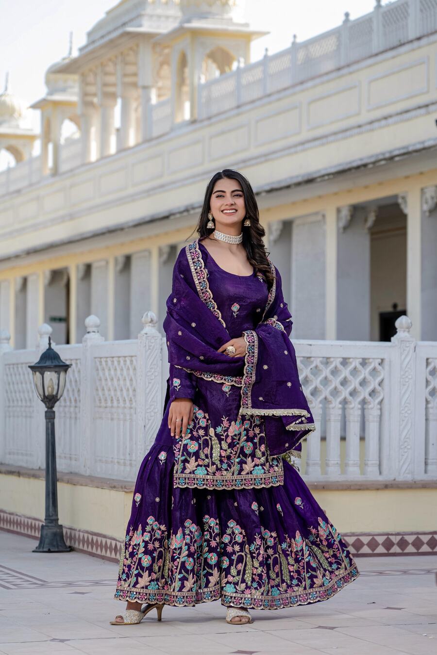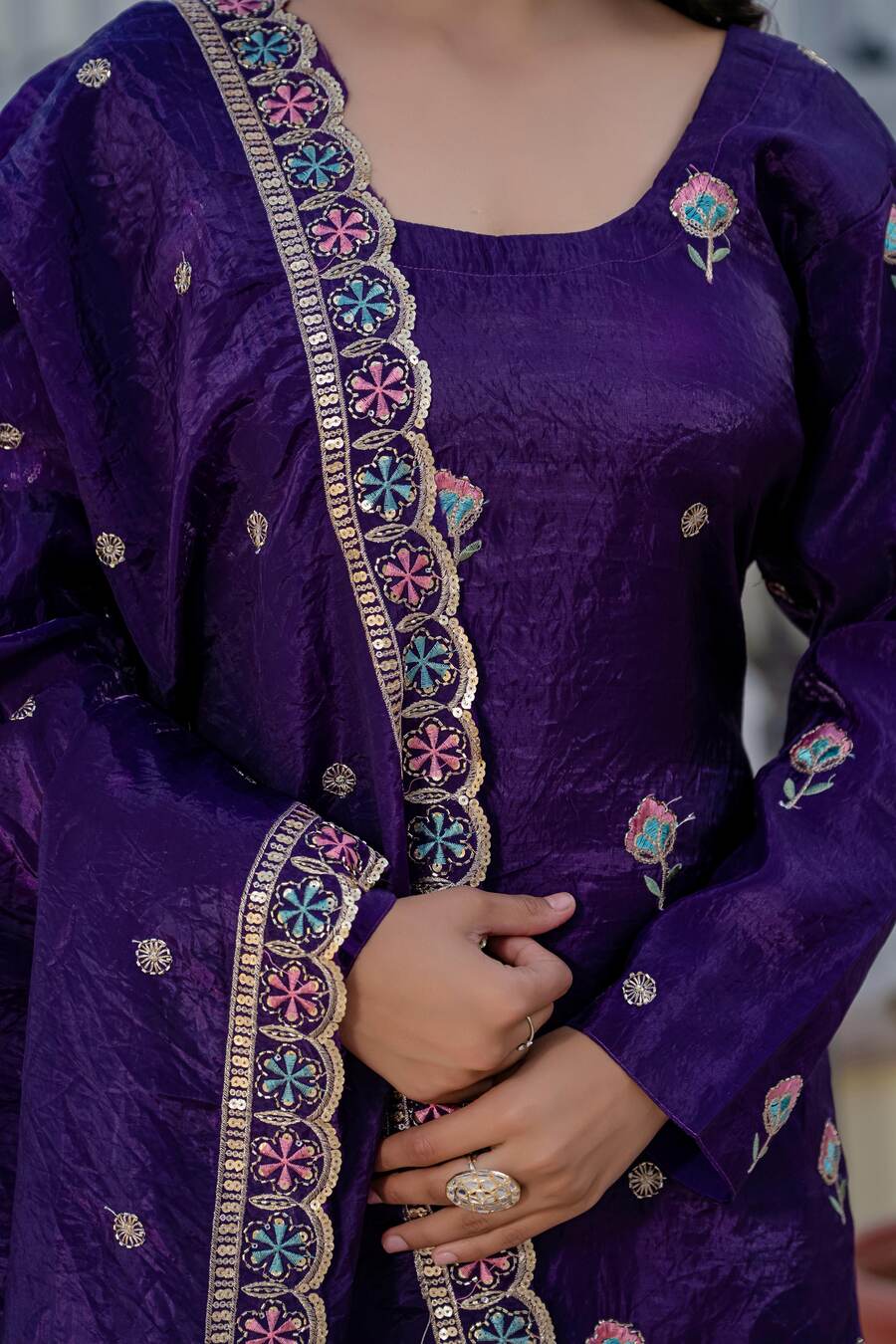 ATTRACTIVE GOLD CRUSH SEQUENCE EMBROIDERY DAMAN WORK TOP PALAZZO WITH DUPATTA PURPLE