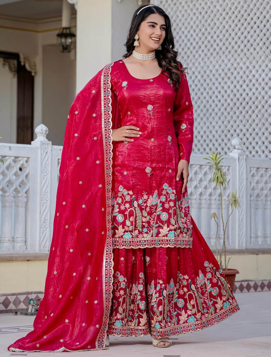 ATTRACTIVE GOLD CRUSH SEQUENCE EMBROIDERY DAMAN WORK TOP PALAZZO WITH DUPATTA RED