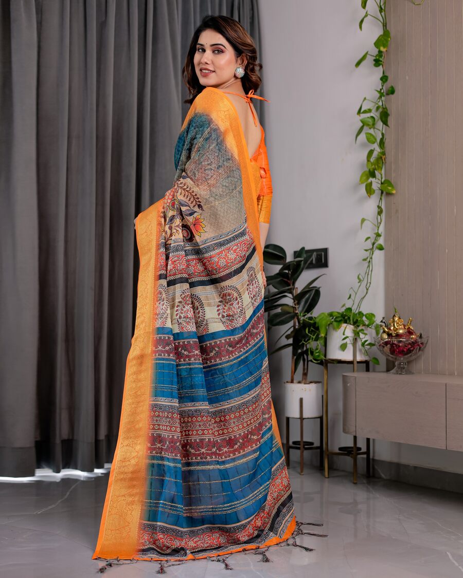 ATTRACTIVE HANDLOOM LINEN DIGITAL FLORAL PRINTS, RICH ZARI WOVEN BORDER WORK SAREE WITH UNSTITCHED BLOUSE RAMA