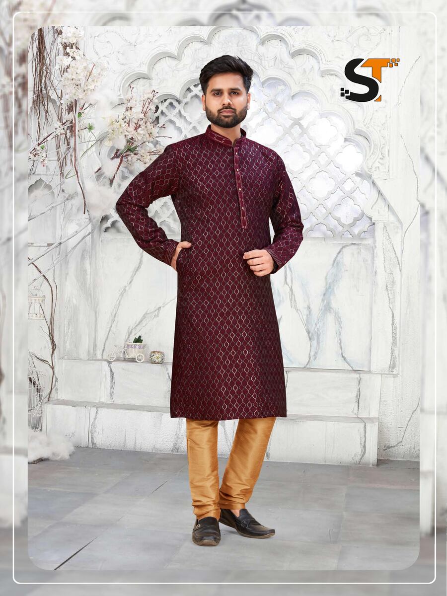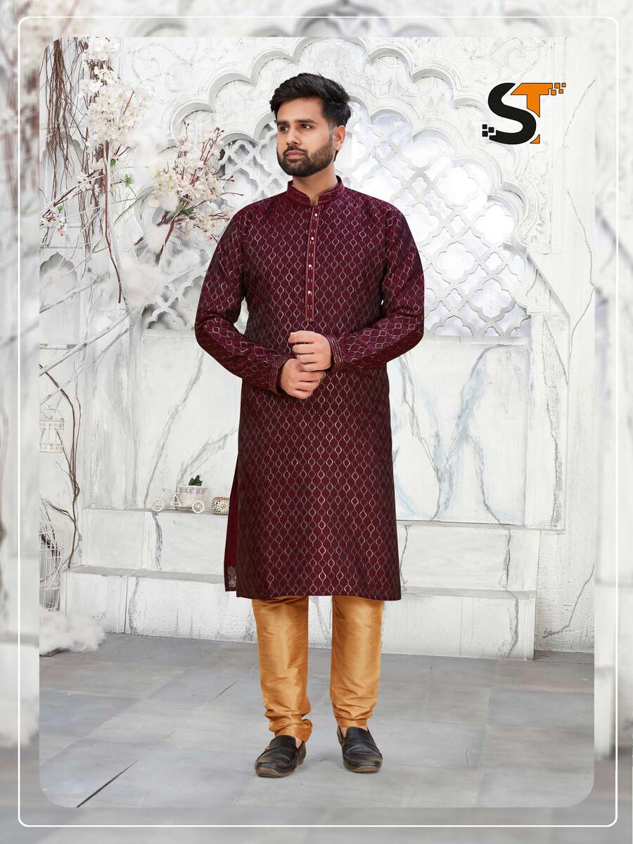 ATTRACTIVE JACQUARD MEN’S KURTA PAYJAMA MAROON