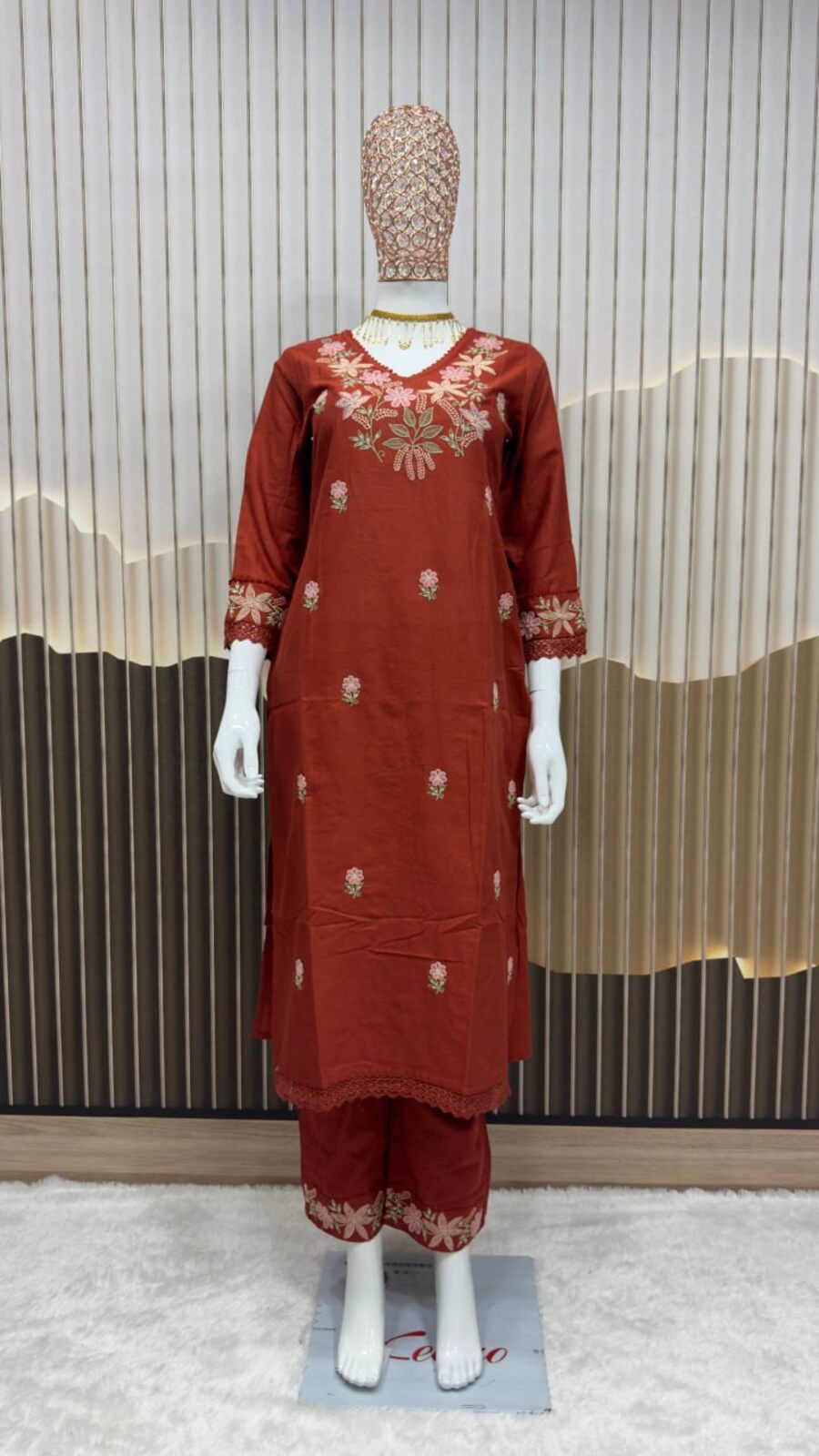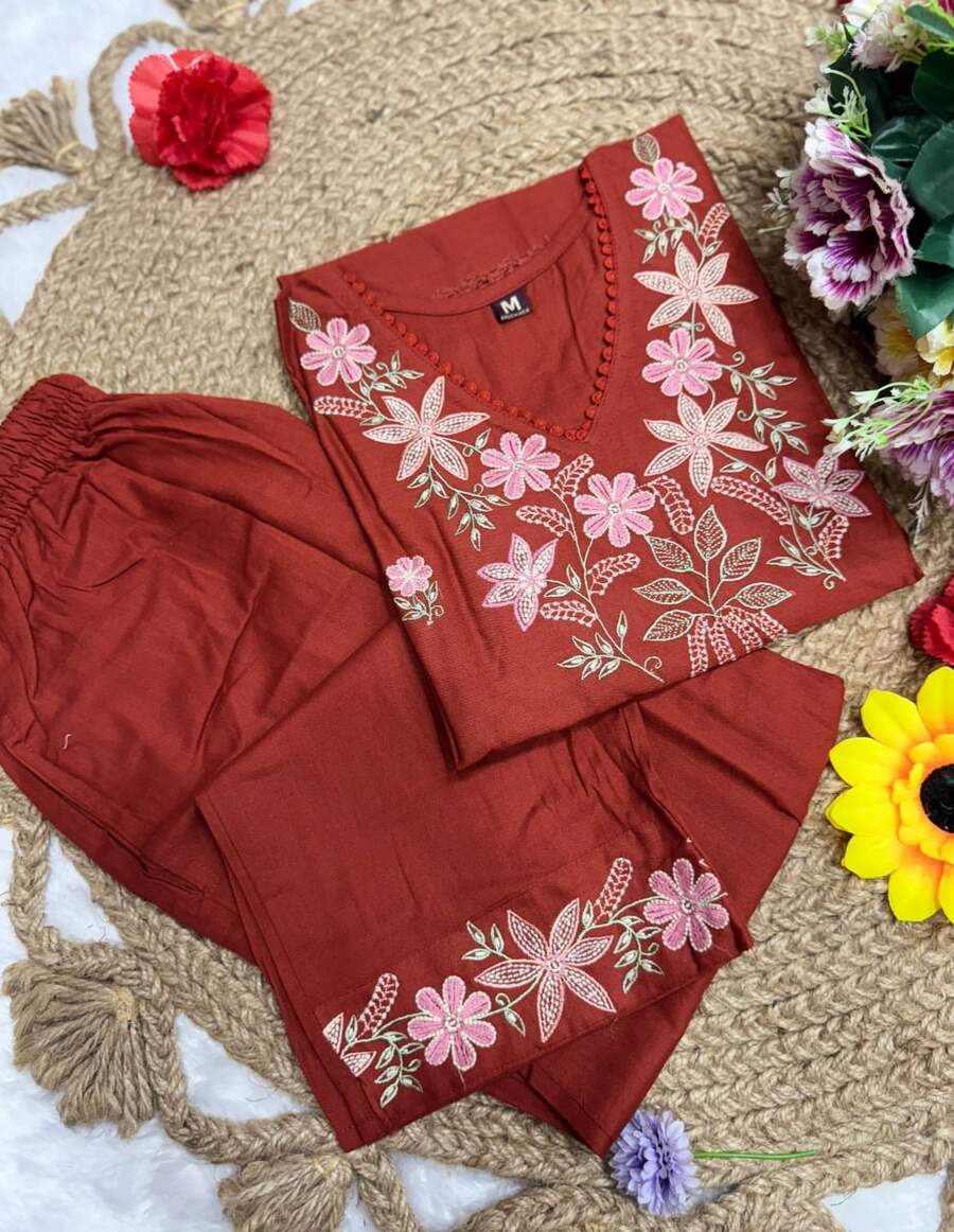ATTRACTIVE KHADI COTTON EMBROIDERY WORK TOP PENT SET BROWN