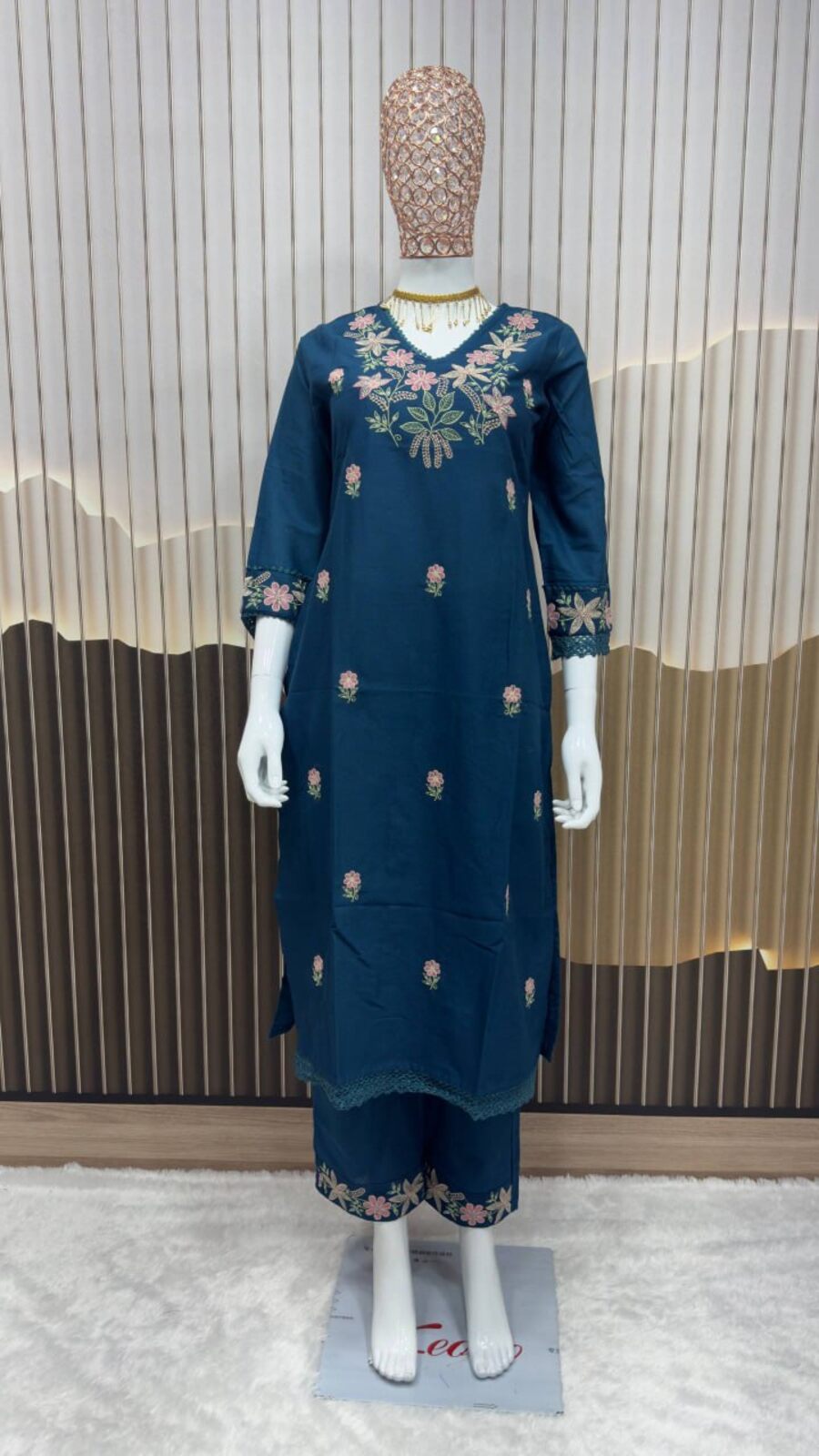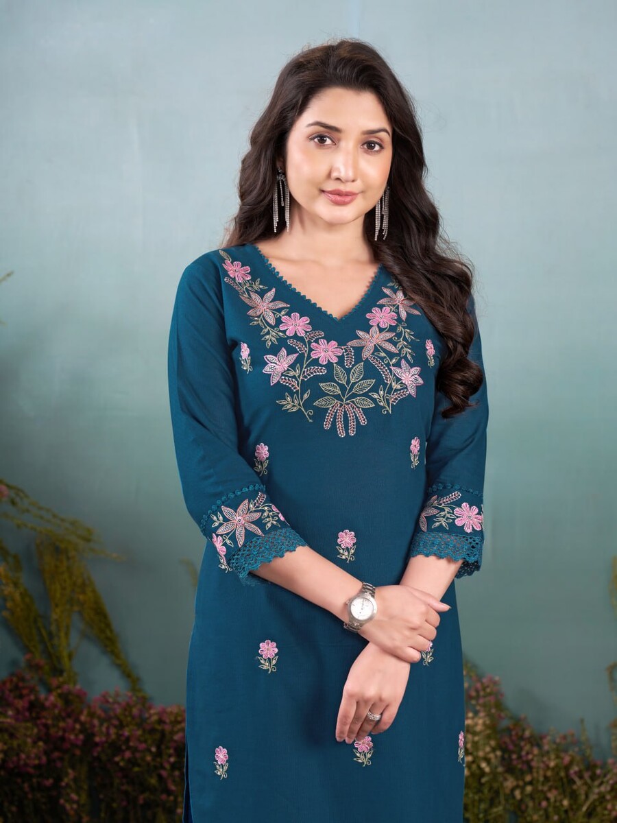ATTRACTIVE KHADI COTTON EMBROIDERY WORK TOP PENT SET TEAL
