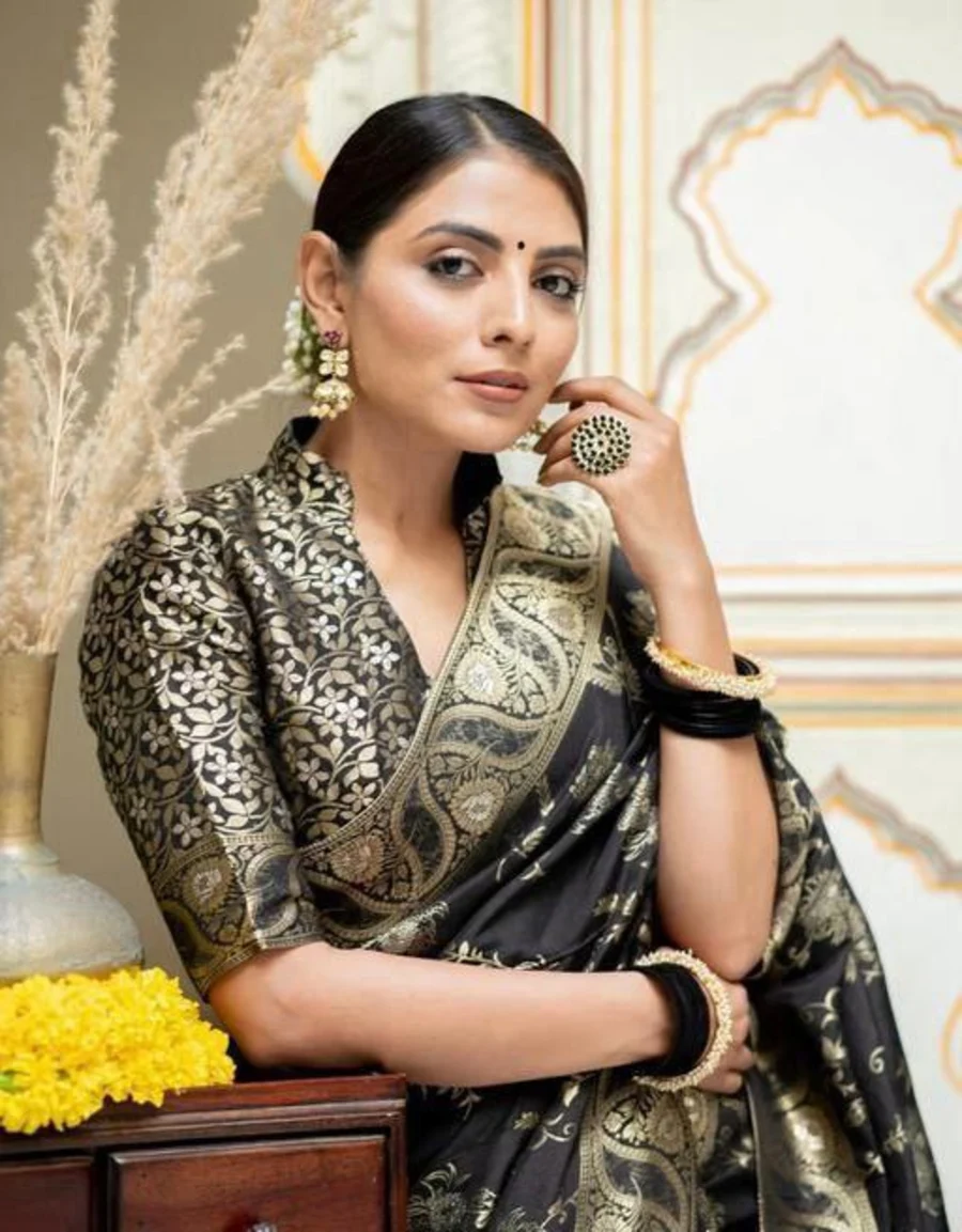 ATTRACTIVE LICHI SILK JACQUARD WORK SAREE WITH UNSTITCHED BLOUSE BLACK