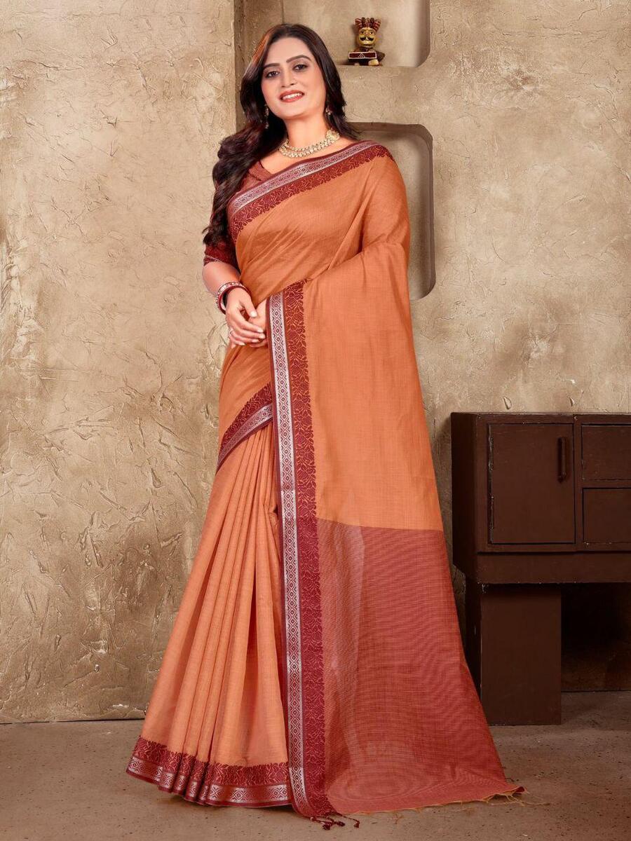 ATTRACTIVE LINEN SOFT SILK WEAVING KANJIVARAM BORDER SAREE WITH UNSTITCHED BLOUSE ORANGE