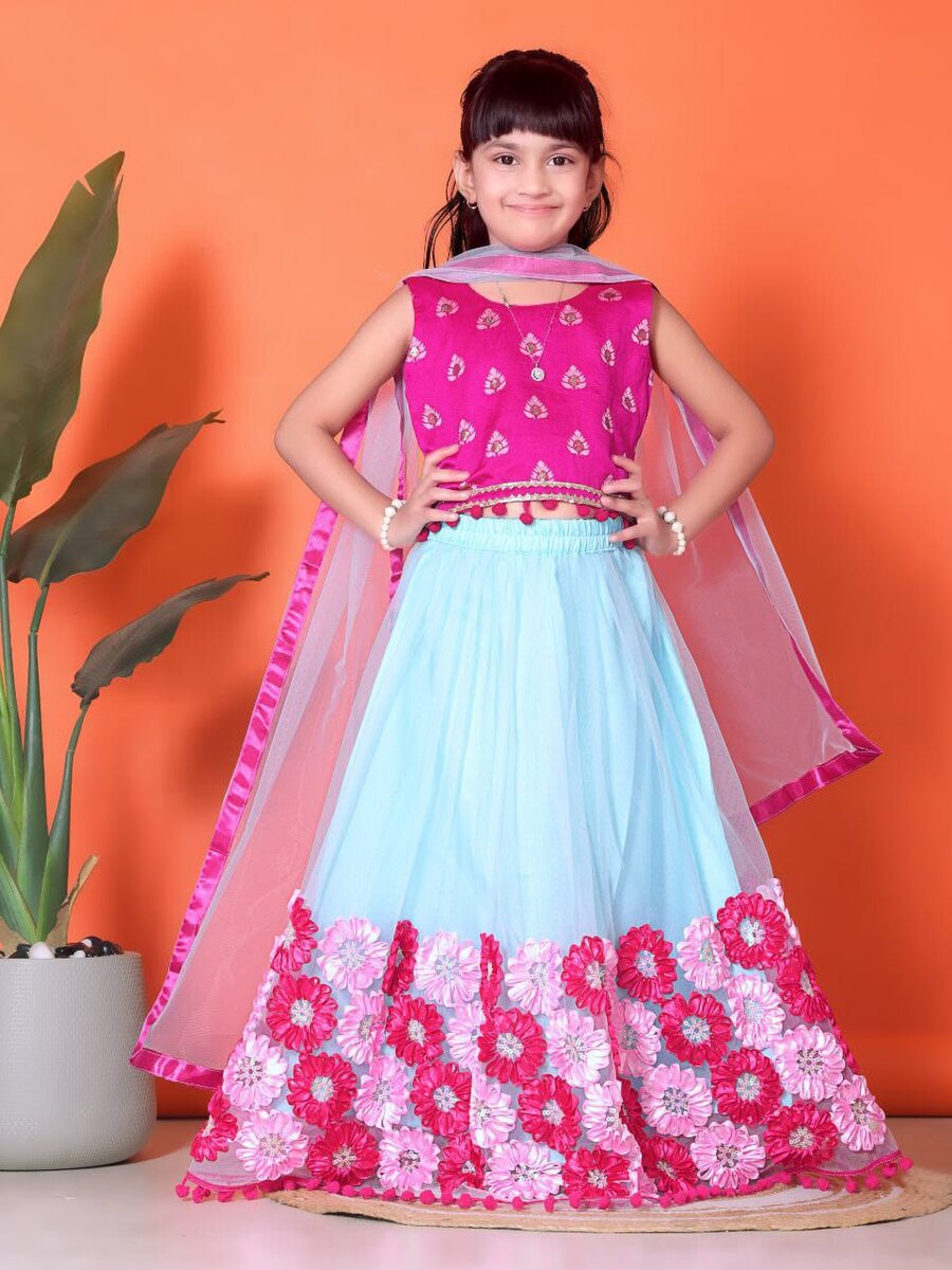 ATTRACTIVE NET JACQUARD EMBROIDERY WORK KID’S LEHENGA CHOLI WITH DUPATTA SKY