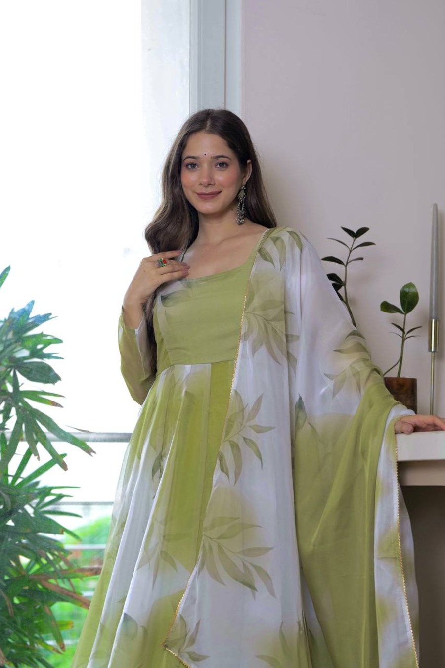ATTRACTIVE ORGANZA FLORAL PRINT WORK ANARKALI GOWN BOTTOM WITH DUPATTA GREEN