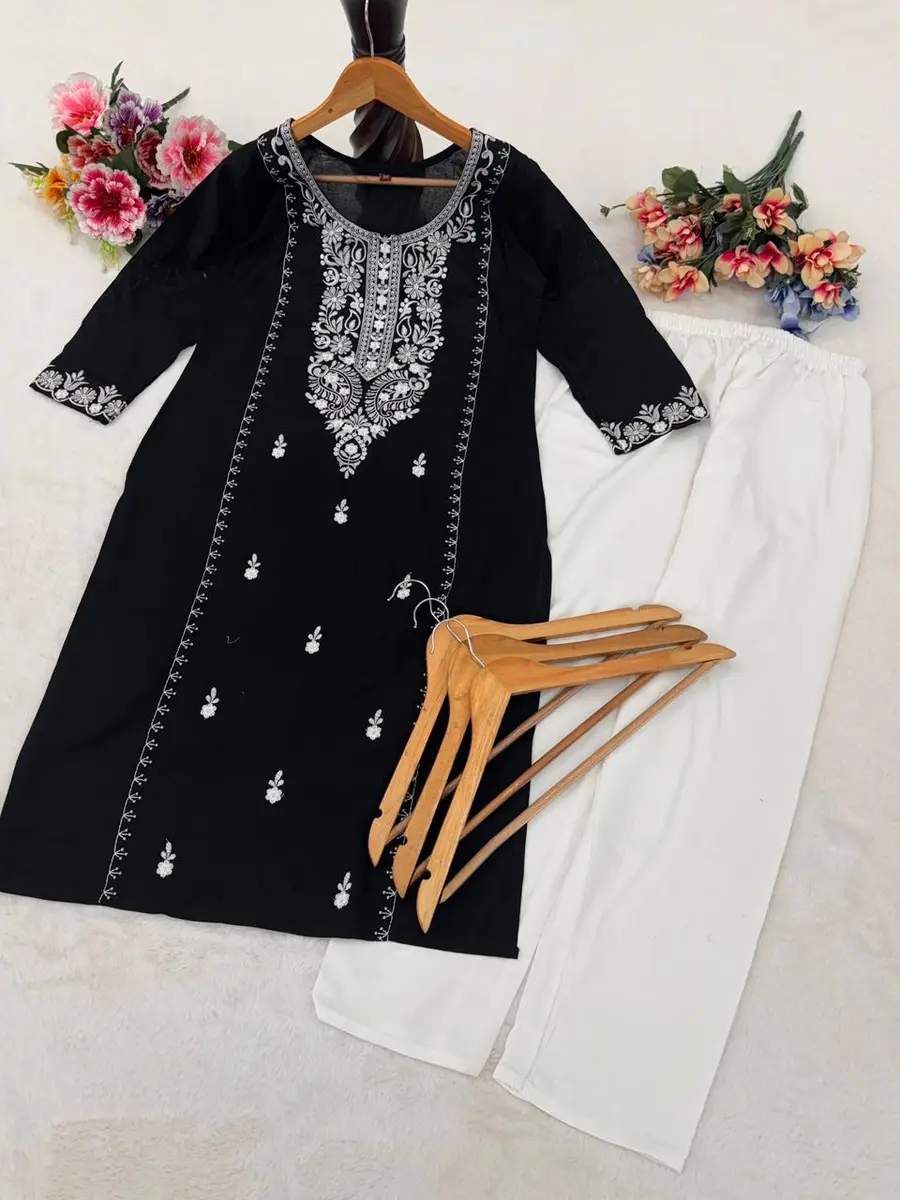ATTRACTIVE RAYON EMBROIDERY WORK TOP PENT SET BLACK