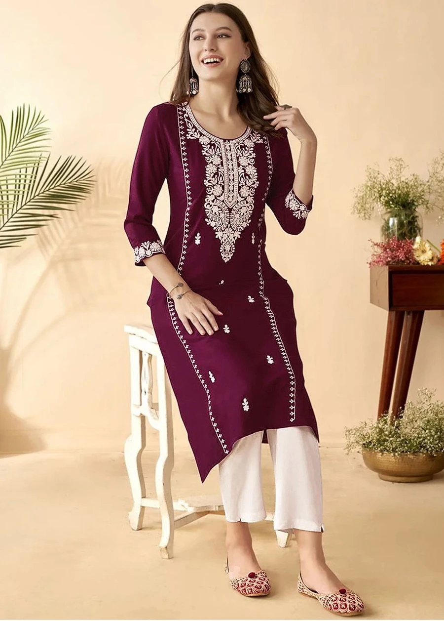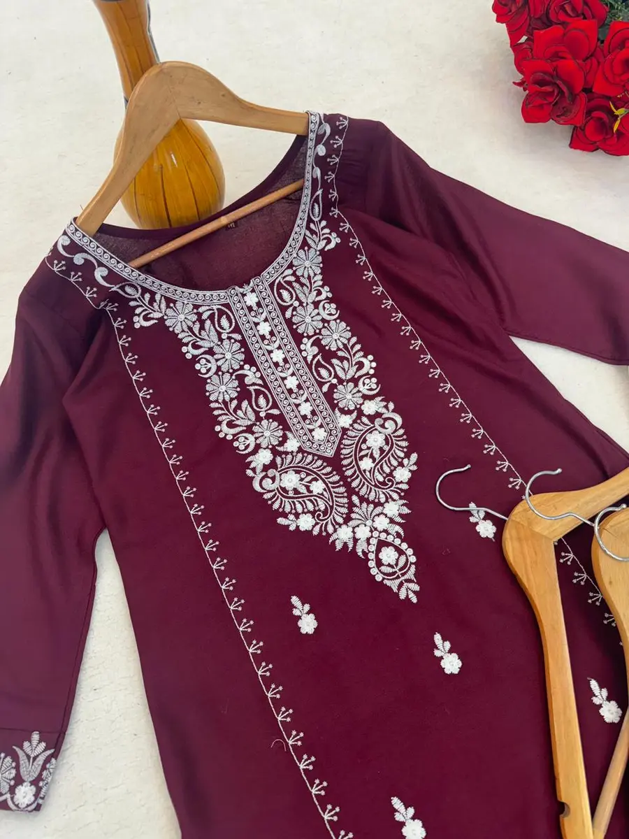 ATTRACTIVE RAYON EMBROIDERY WORK TOP PENT SET WINE