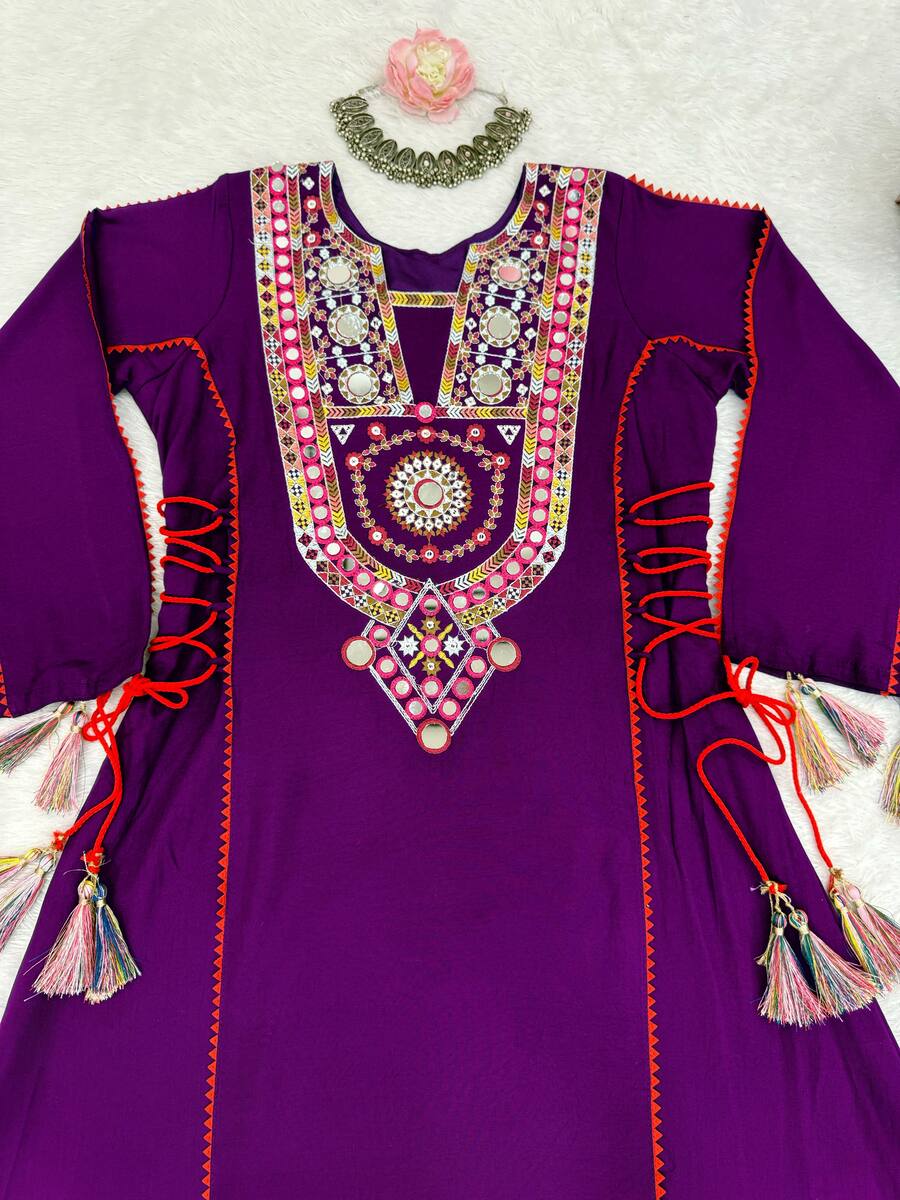 ATTRACTIVE RAYON THREAD AND REAL MIRROR WITH TASSELS AND FANCY LACE WORK CO-ORD SET PURPLE
