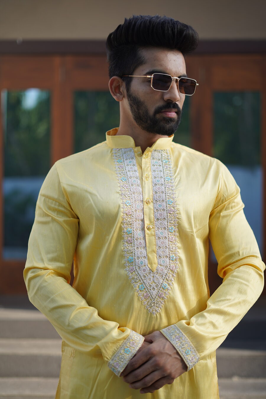 ATTRACTIVE SHINY SILK CODING WORK MEN’S KURTA PAYJAMA YELLOW