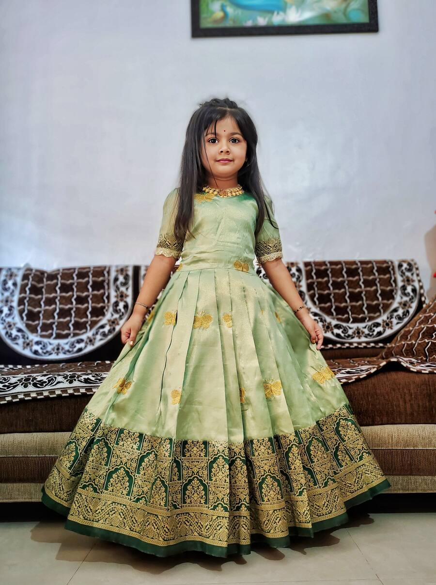 ATTRACTIVE SILK EMBROIDERY BUTTERFLY AND BIRD WORK KID’S GOWN GREEN