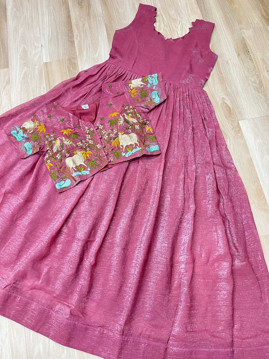 ATTRACTIVE SILVER CRUNCY PLAIN GOWN WITH EMBROIDERY WORK ON KOTI PINK