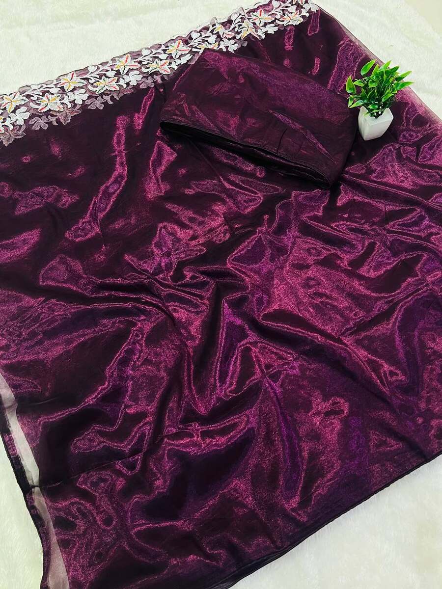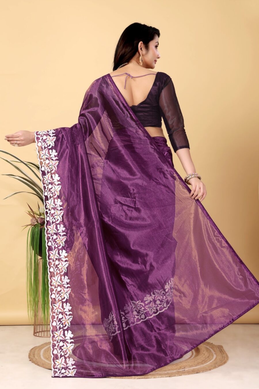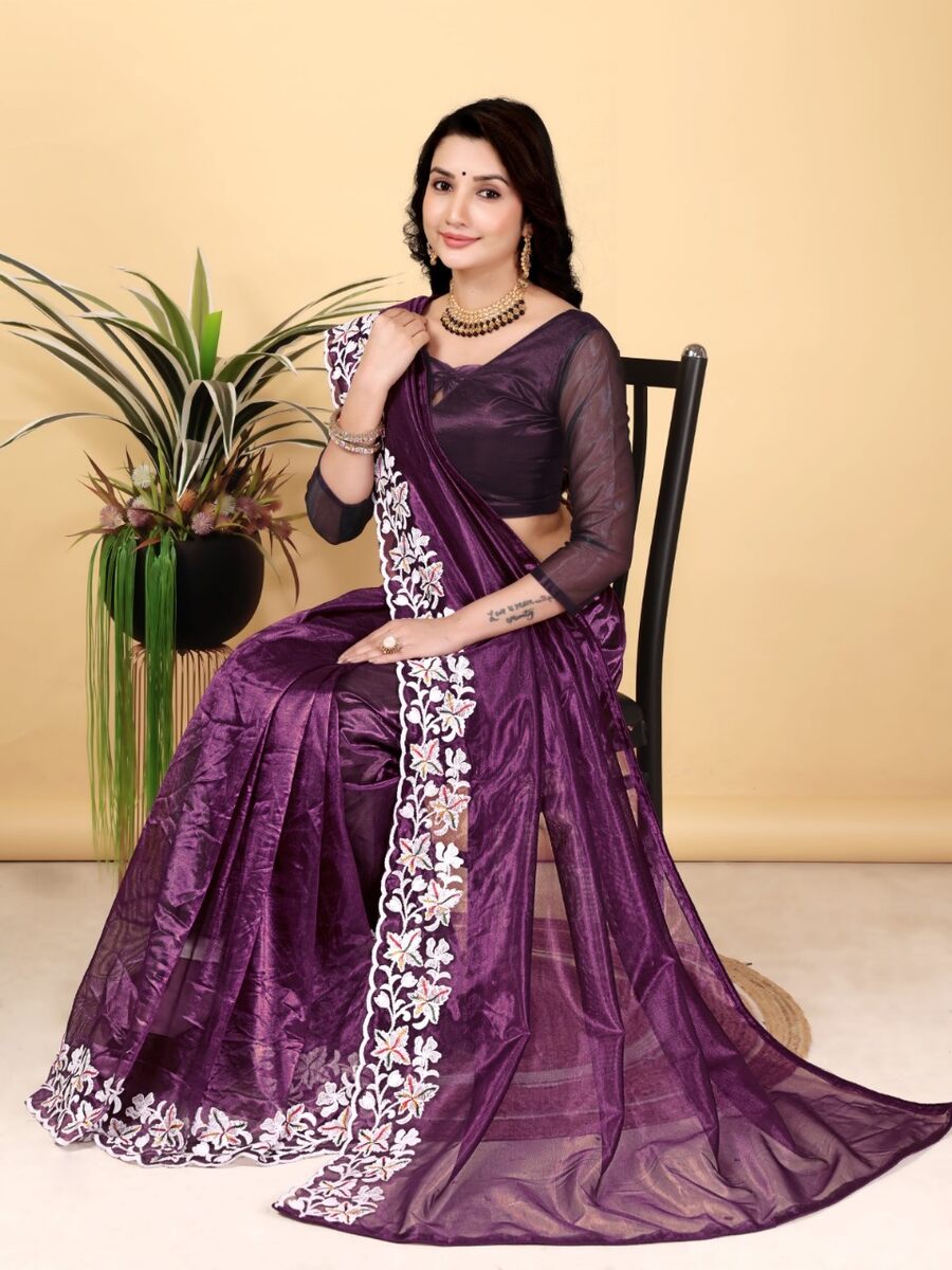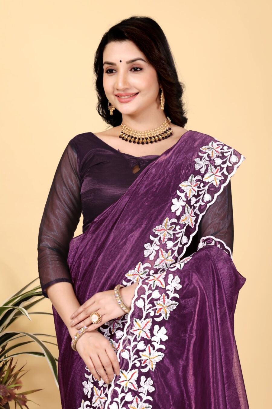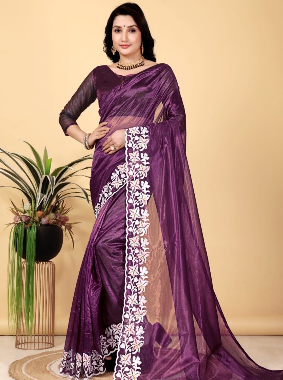 ATTRACTIVE TWILL NET MULTI WORK SAREE WITH UNSTITCHED BLOUSE PURPLE