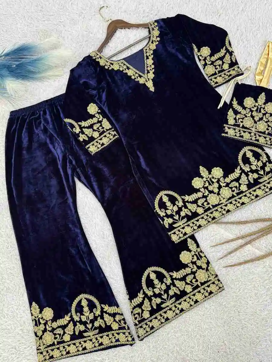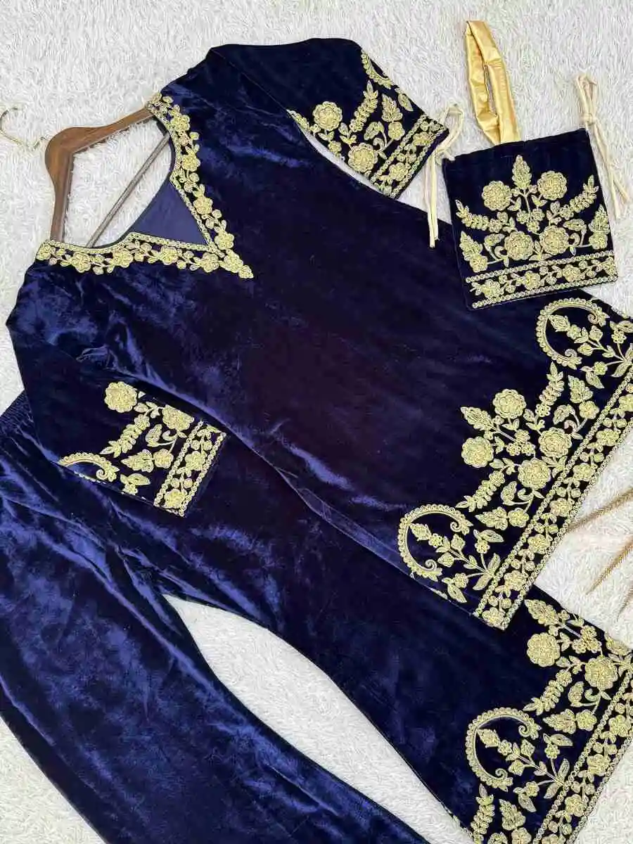ATTRACTIVE VELVET EMBROIDERY CHAIN STITCHED WORK TOP PALAZZO WITH POTLI BAG NAVY BLUE