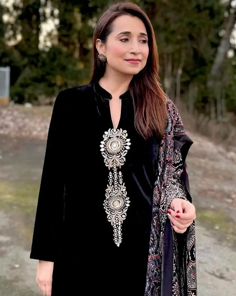 TOP FABRIC :HEAVY PURE VISCOSE VELVET WITH EMBROIDERY 5 MM SEQUENCE WORK WITH FANCY BELL SLEEVE & FANCY MOTI LATKAN