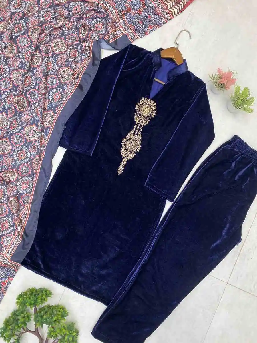 ATTRACTIVE VELVET SEQUENCE EMBROIDERY WORK TOP BOTTOM WITH DUPATTA BLUE