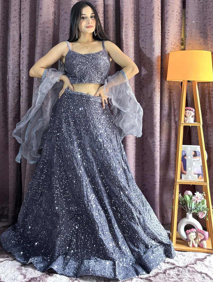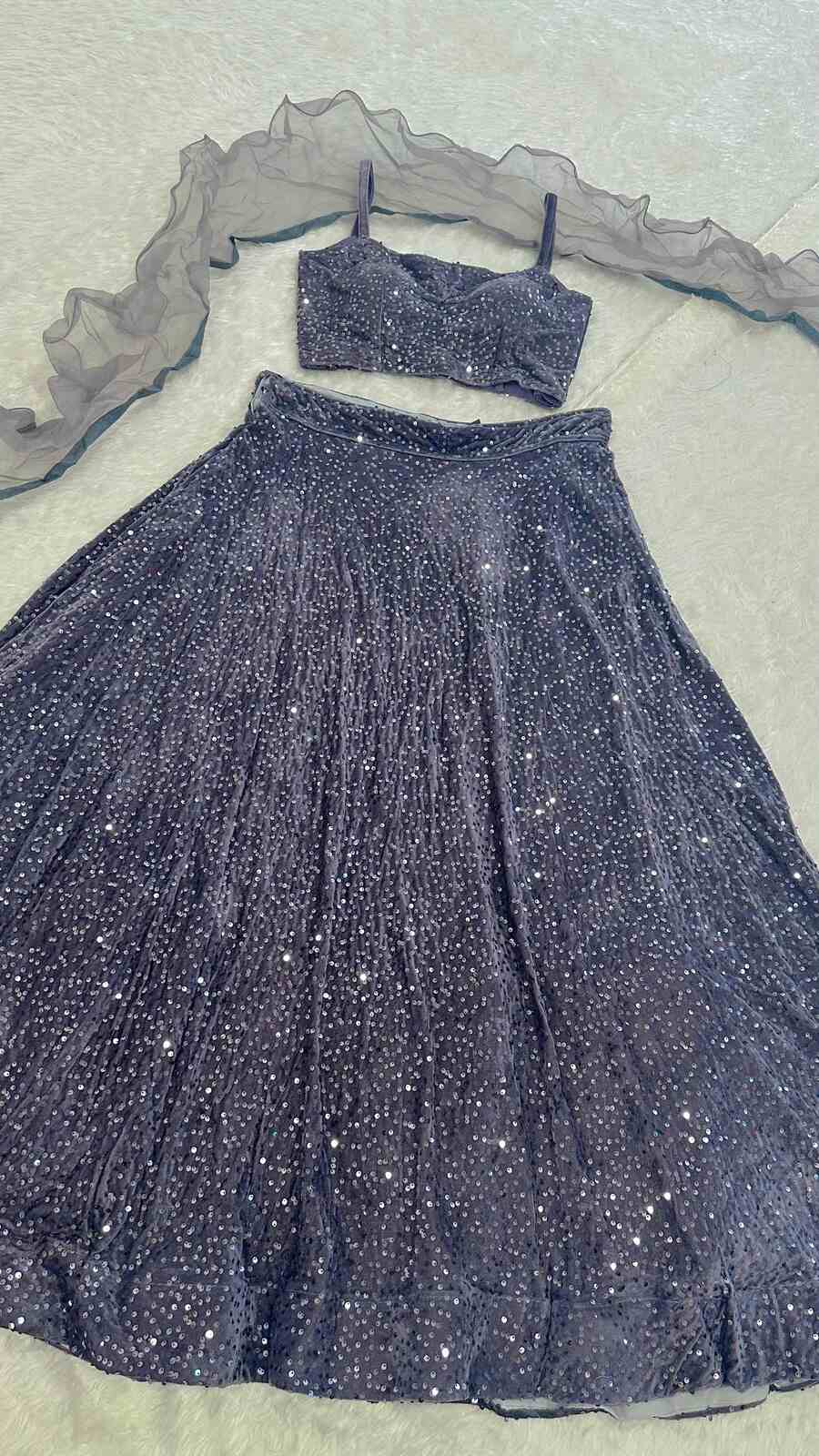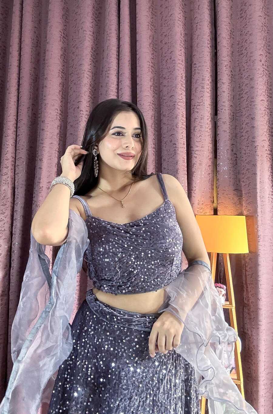 ATTRACTIVE VELVET SEQUENCE WORK LEHENGA CHOLI WITH DUPATTA GREY
