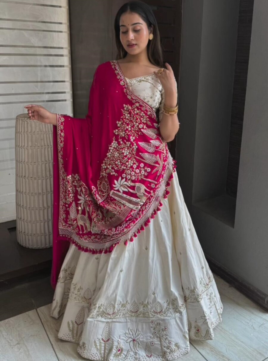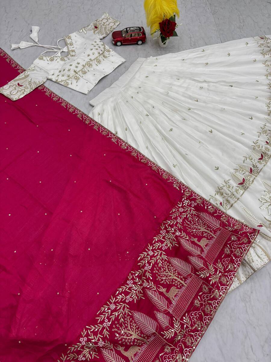 ATTRACTIVE VICHITRA SILK EMBROIDERY THREAD & SEQUENCE WORK LEHENGA CHOLI WITH DUPATTA WHITE