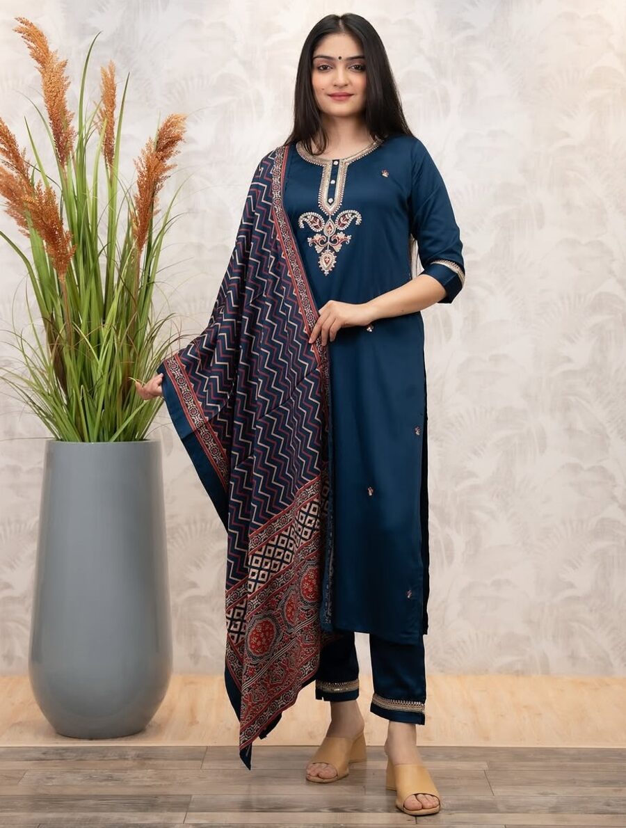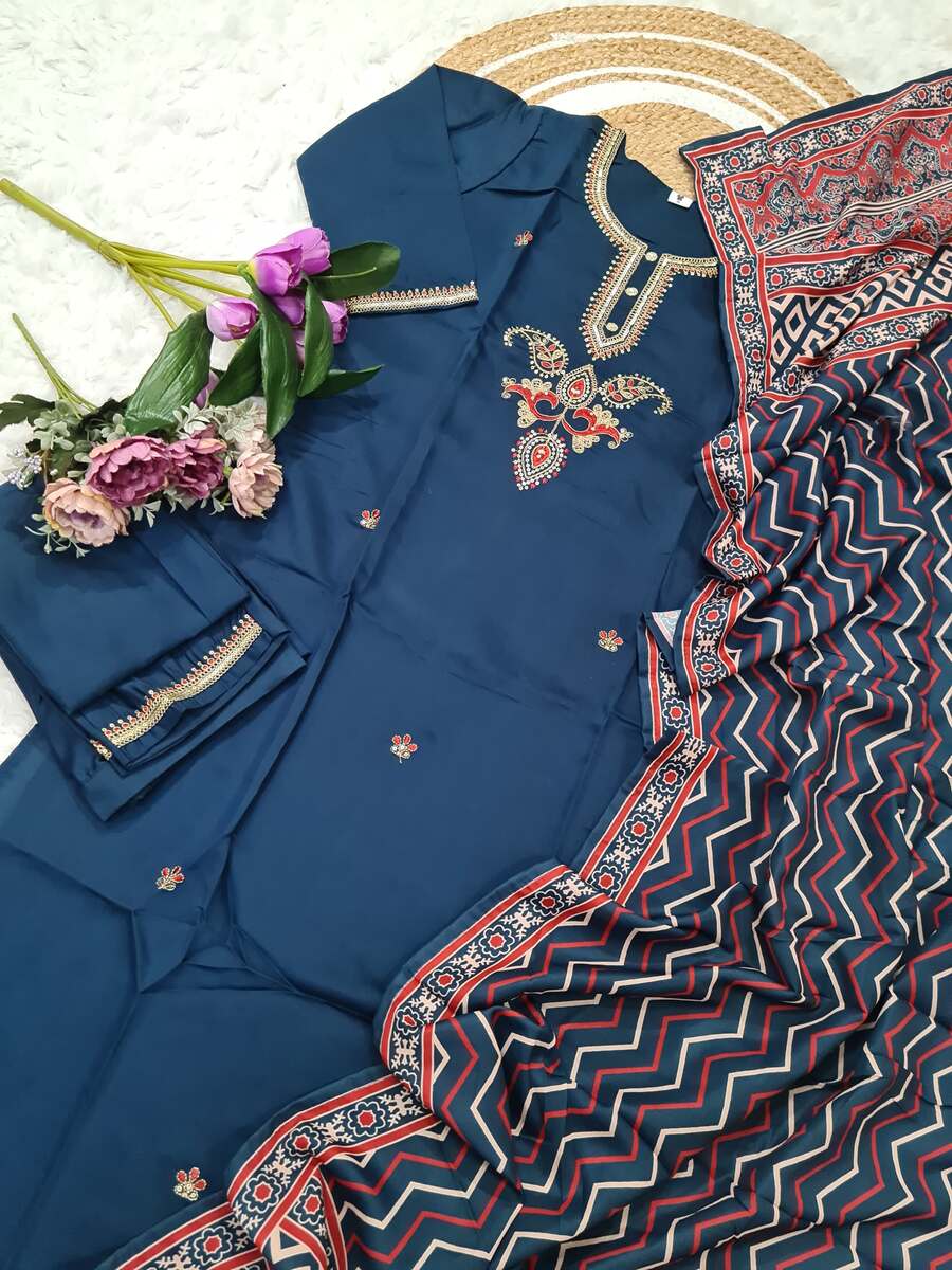 ATTRACTIVE VISCOSE CHANDERI SEQUENCE CODING EMBROIDERY WORK TOP BOTTOM WITH DUPATTA TEAL