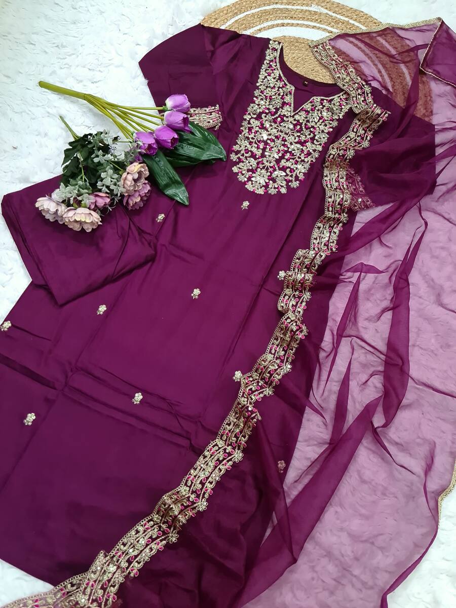 ATTRACTIVE VISCOSE CHANDERI SEQUENCE CODING EMBROIDERY WORK TOP BOTTOM WITH DUPATTA WINE