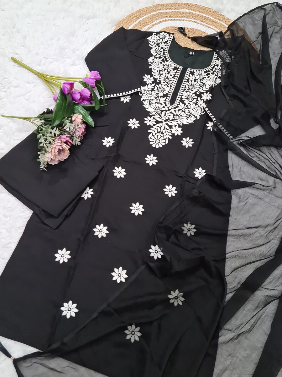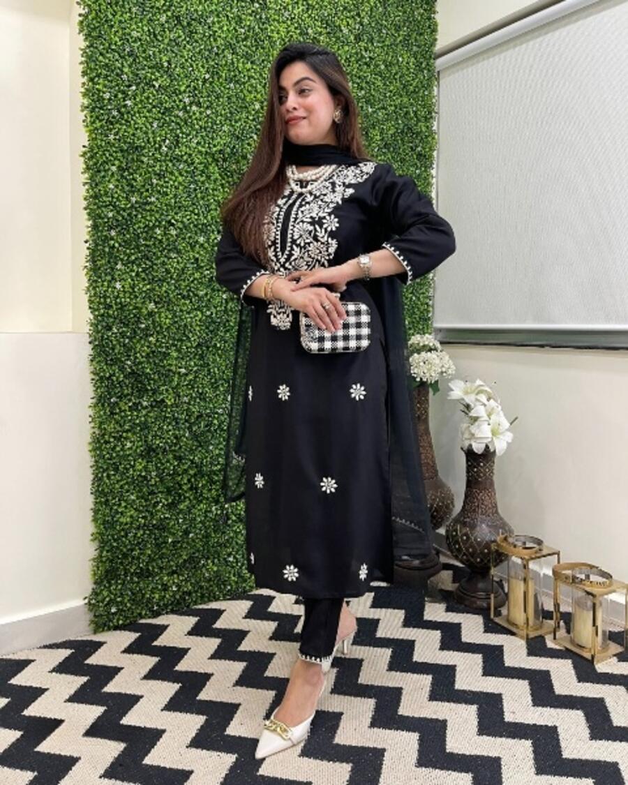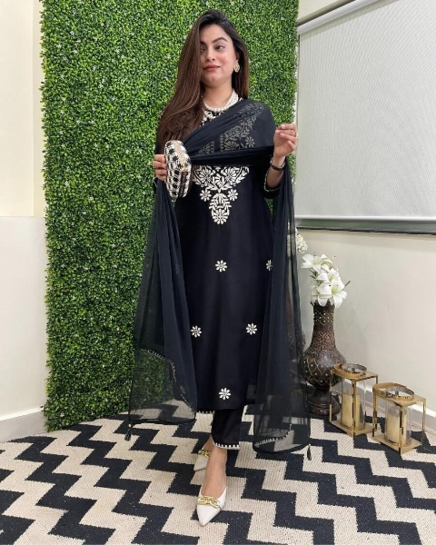 ATTRACTIVE VISCOSE CHANDERI SEQUENCE EMBROIDERY WORK TOP BOTTOM WITH DUPATTA BLACK