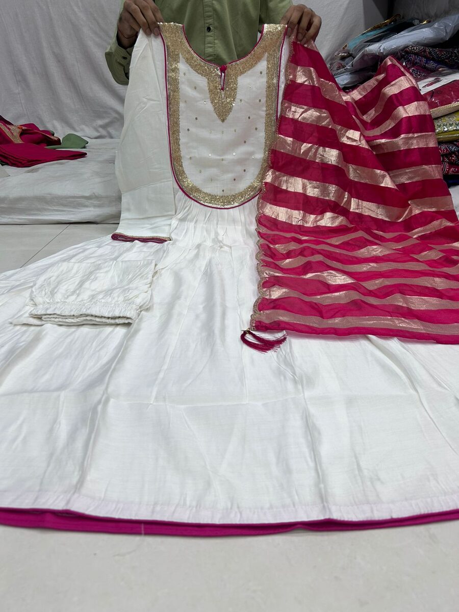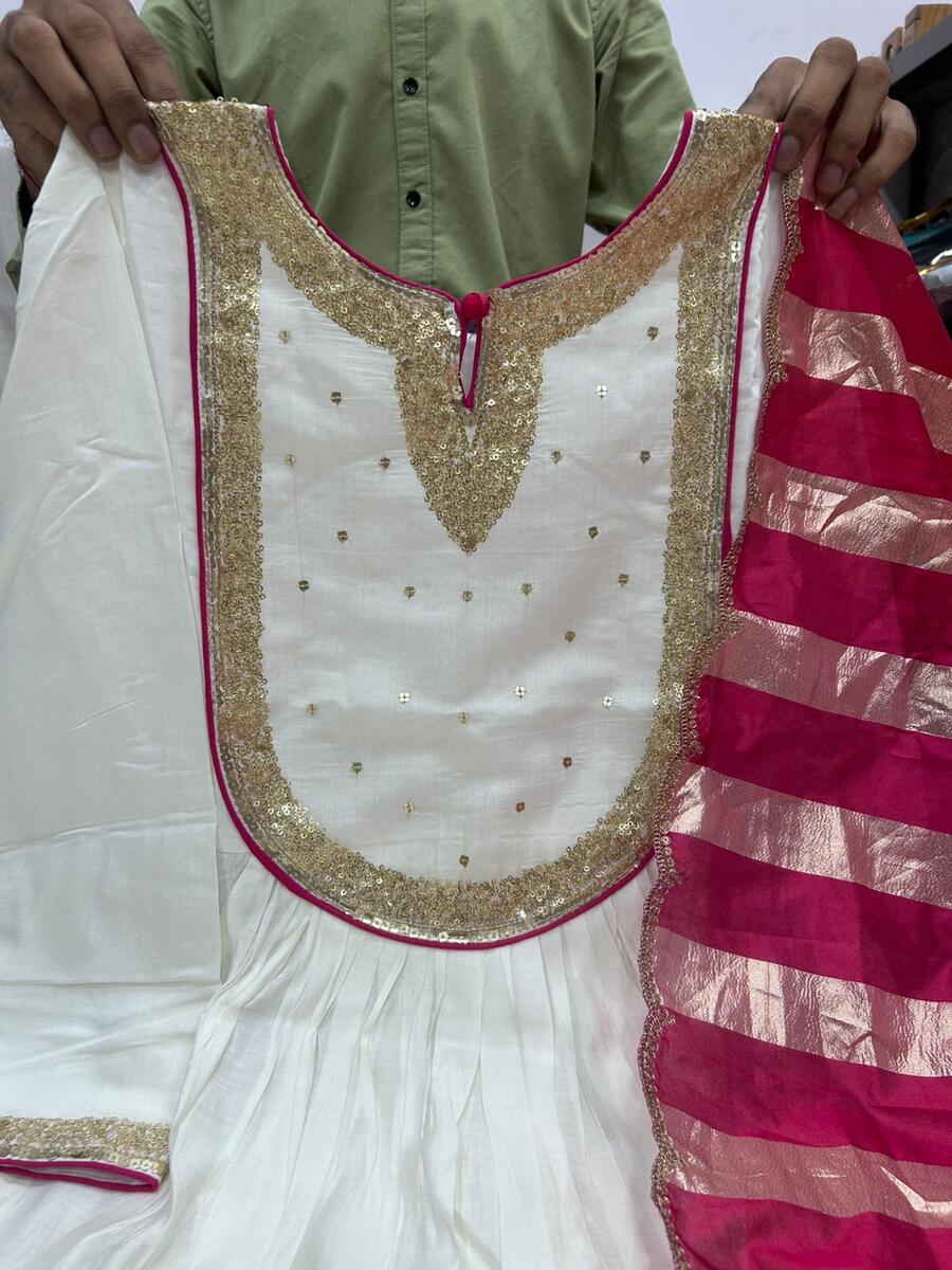 ATTRACTIVE VISCOSE ROMAN SILK HAND EMBROIDERY, ZARI WEAVING WORK TOP BOTTOM WITH DUPATTA WHITE