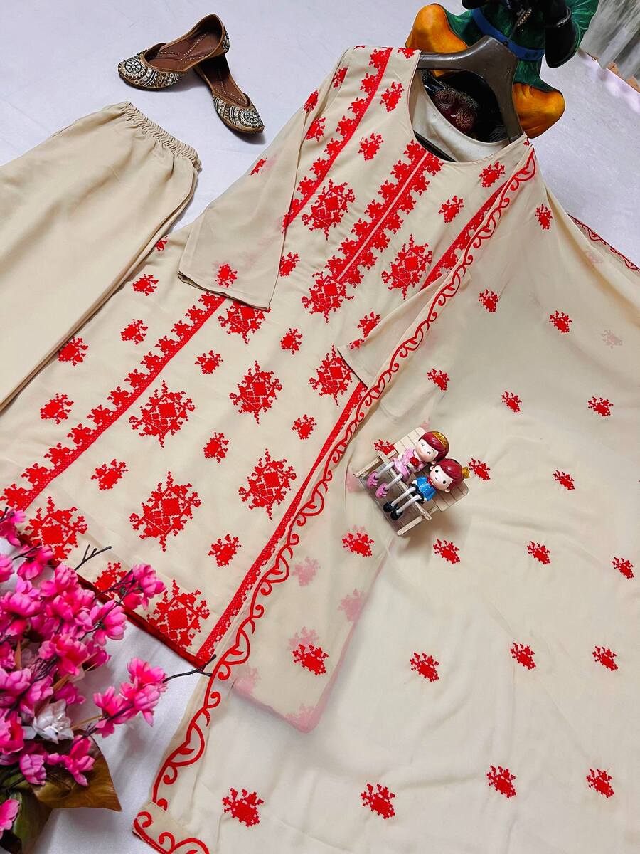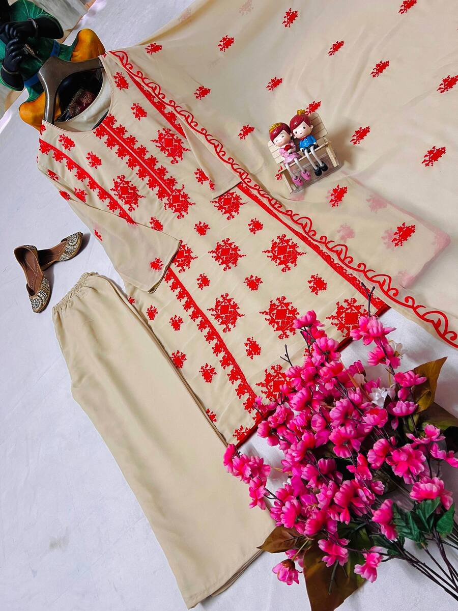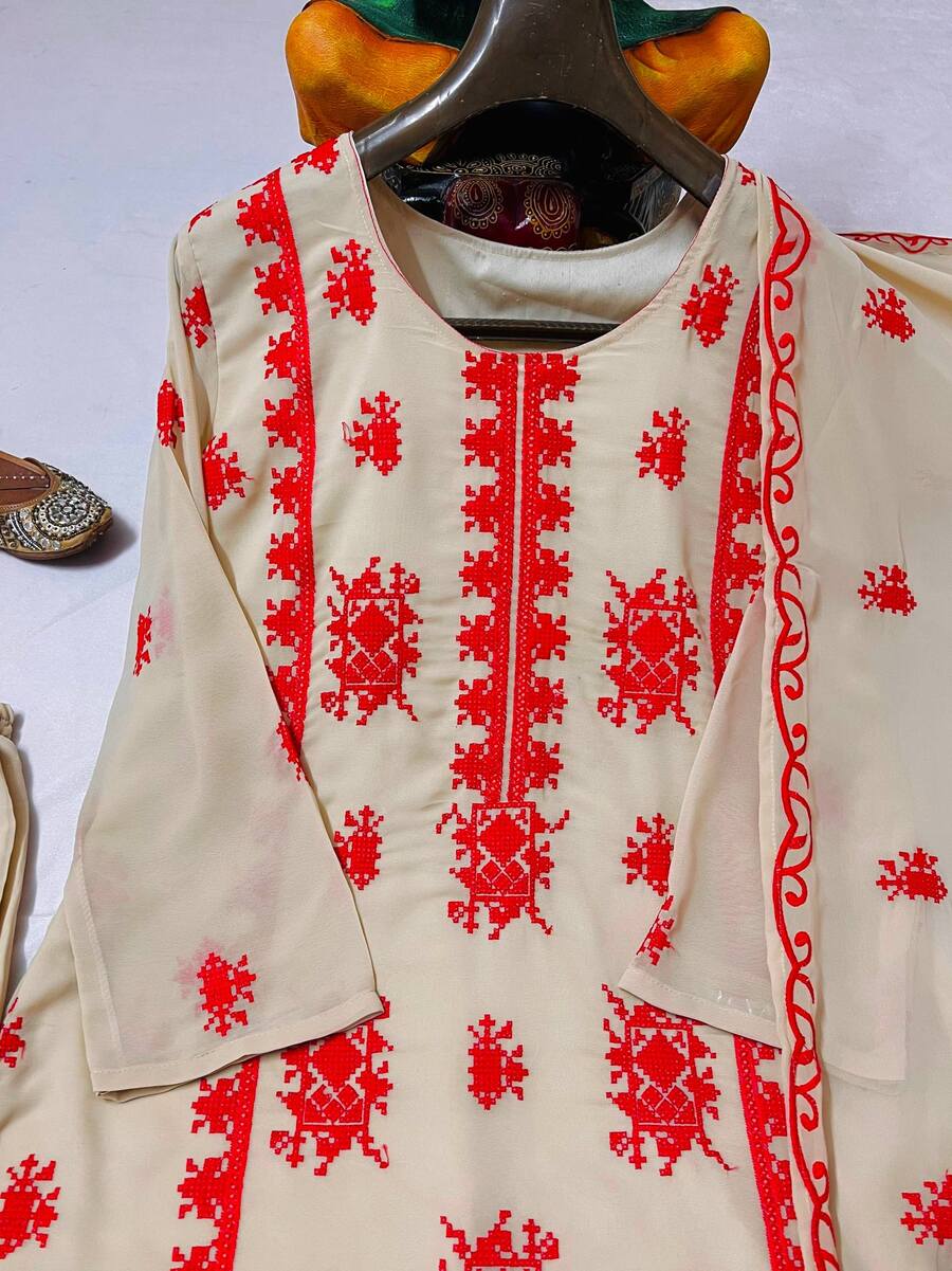 BOLLYWOOD GEORGETTE THREAD EMBROIDERY WORK & FANCY LACE WORK TOP BOTTOM WITH DUPATTA RED