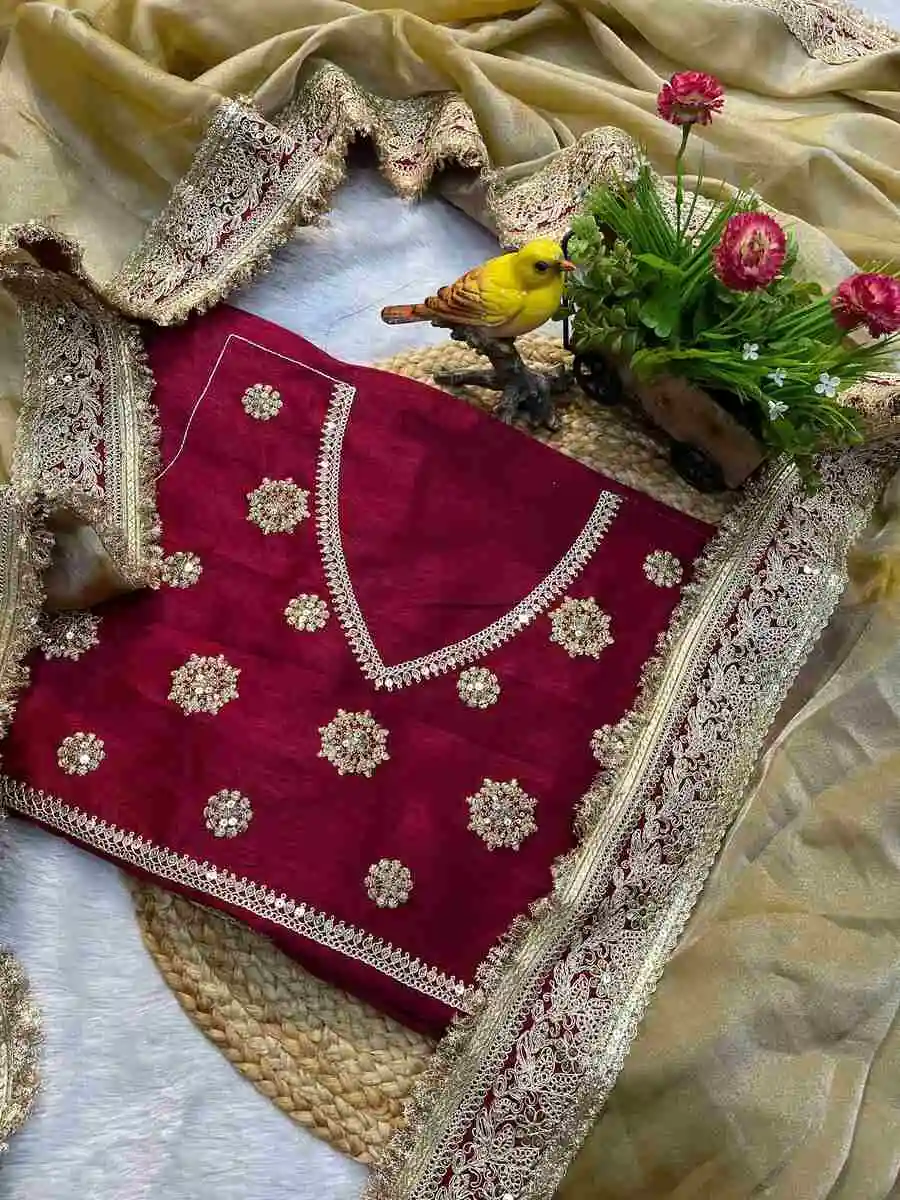 SAREE FABRIC : PREMIUM DIAMOND CHINON SILK WITH HEAVY EMBROIDERY CODING MULTI TREADS AND SEQUENCE WORK