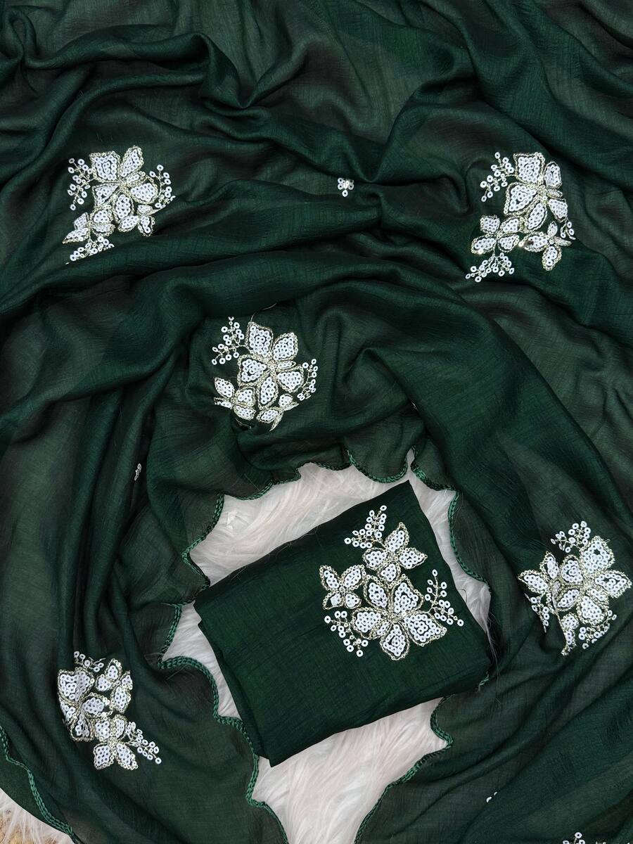 SAREES FABRIC :- JIMMY CHOO FABRIC WITH DUAL COLOUR SEQUENCE AND THREAD EMBROIDERY WORK AND ARC CUT BORDER WITH ALL OVER BUTTA WORK