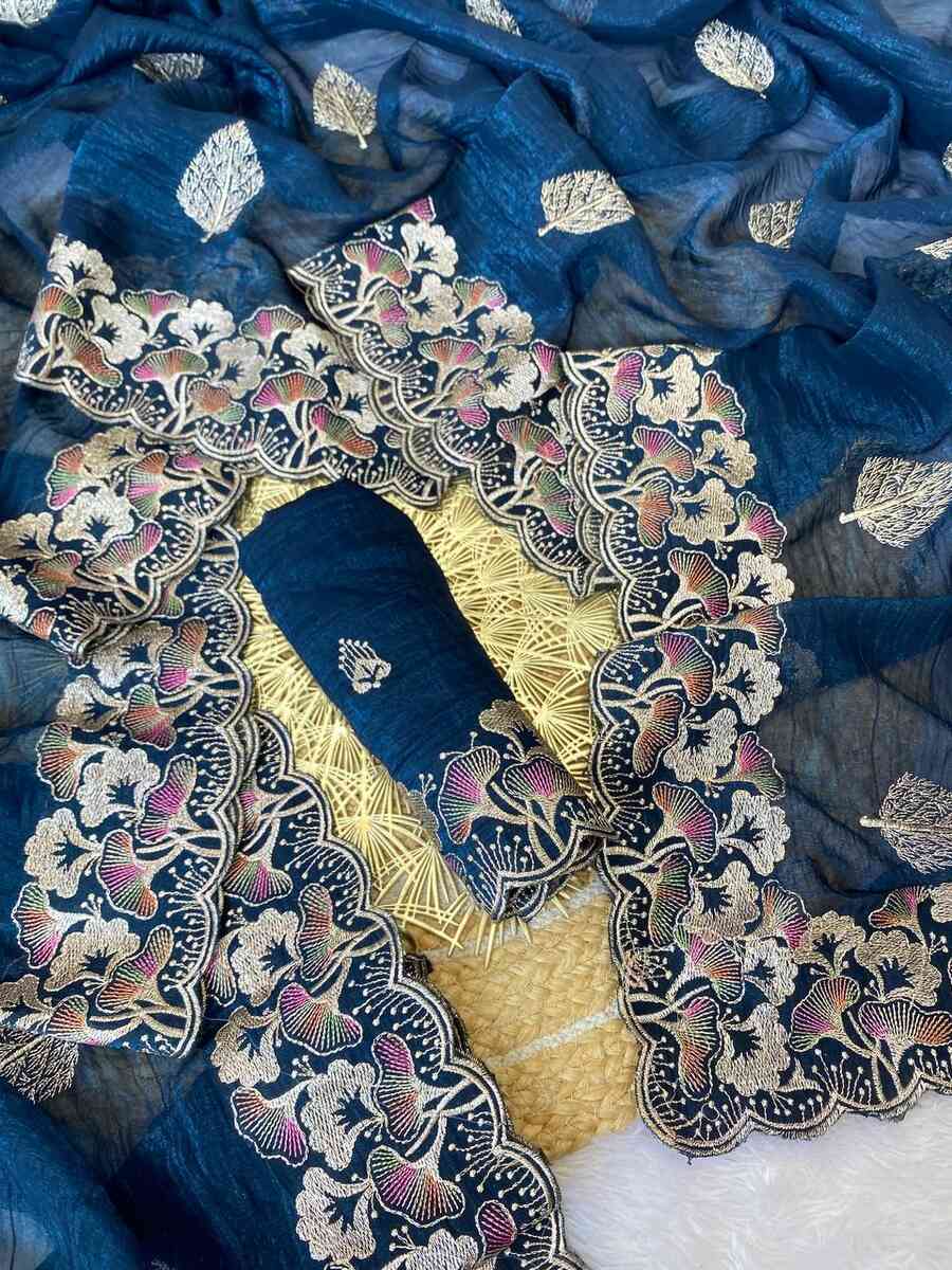 CRUNCHY SILK EMBROIDERY WITH MULTI COLOUR THREAD WORK SAREE WITH UNSTITCHED BLOUSE BLUE