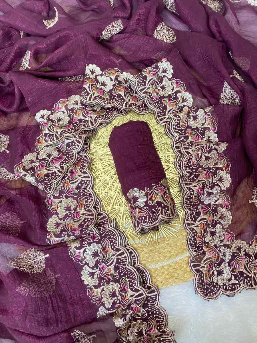 CRUNCHY SILK EMBROIDERY WITH MULTI COLOUR THREAD WORK SAREE WITH UNSTITCHED BLOUSE WINE