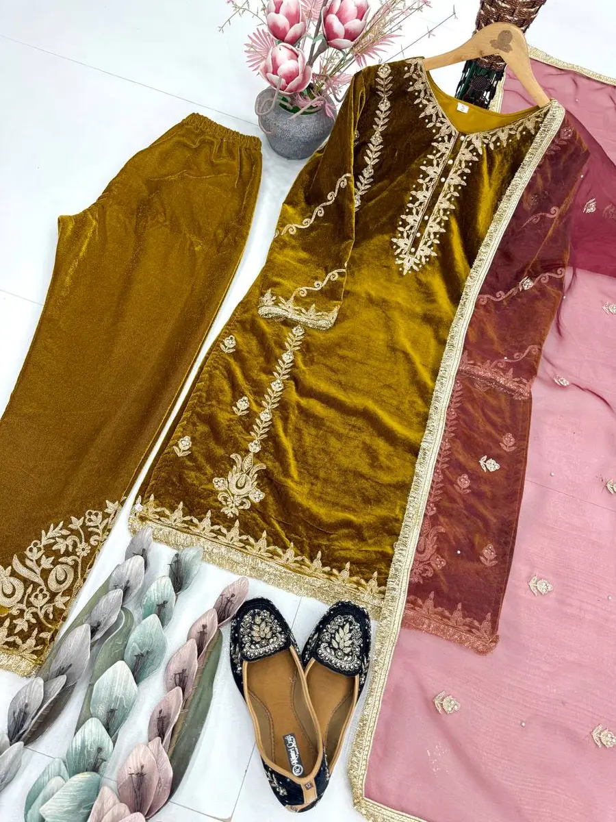 DESIGNE VELVET CHAIN STITCHED WORK WITH PERAL MOTI HAND WORK AND FANCY LACE BORDER WORK TOP BOTTOM WITH DUPATTA MUSTARD