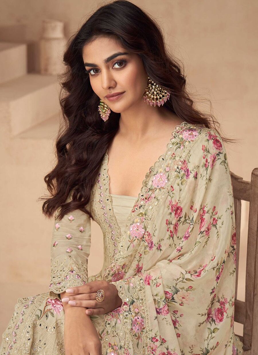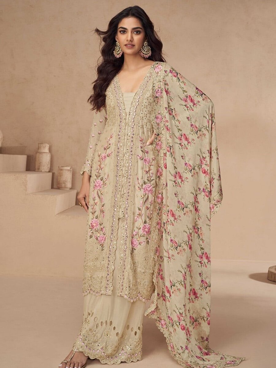 DESIGNER AIRTEX CHINON EMBROIDERY SEQUENCE WORK WITH MIRROR AND DIAMOND WORK TOP PALAZZO WITH DUPATTA OFF WHITE