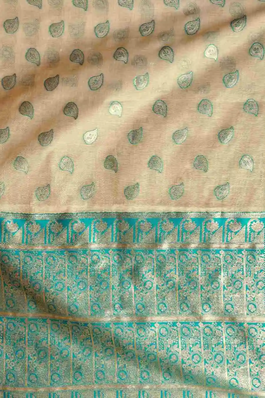 DESIGNER BANARASI JARI WITH ZHALLAR WORK SAREE WITH UNSTITCHED BLOUSE RAMA AND CREAM