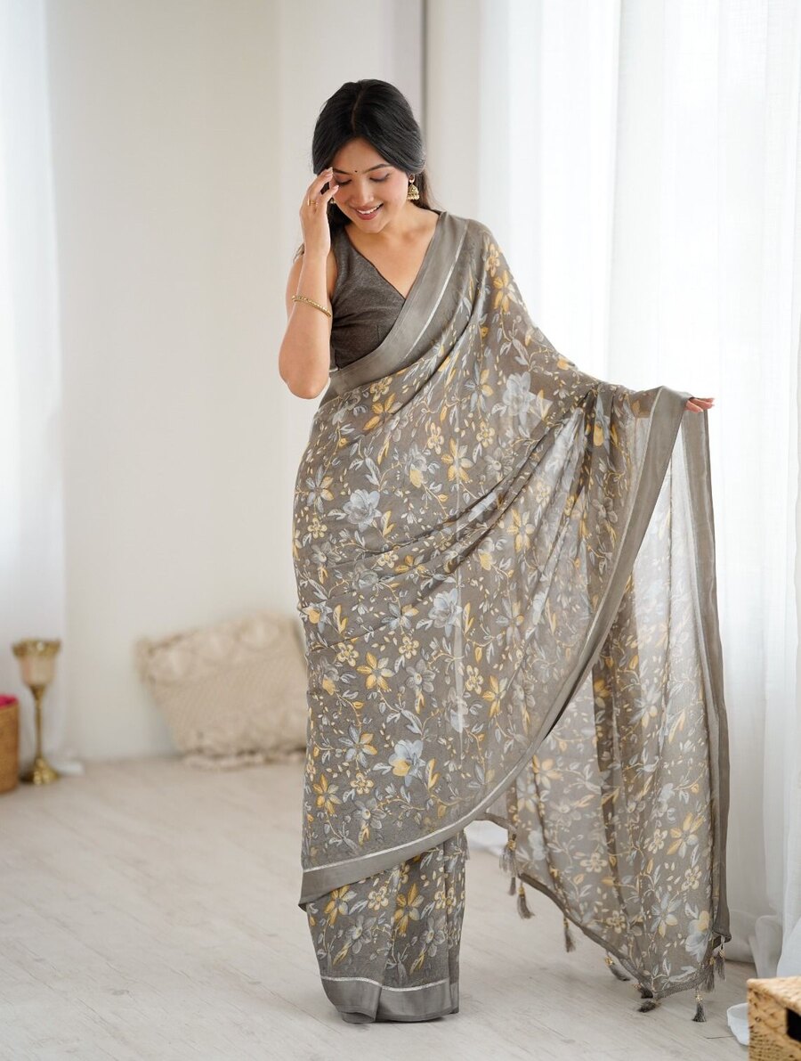 DESIGNER BRIGHT MOSS SATIN PATTA PRINTED WORK SAREE WITH UNSTITCHED BLOUSE GREY