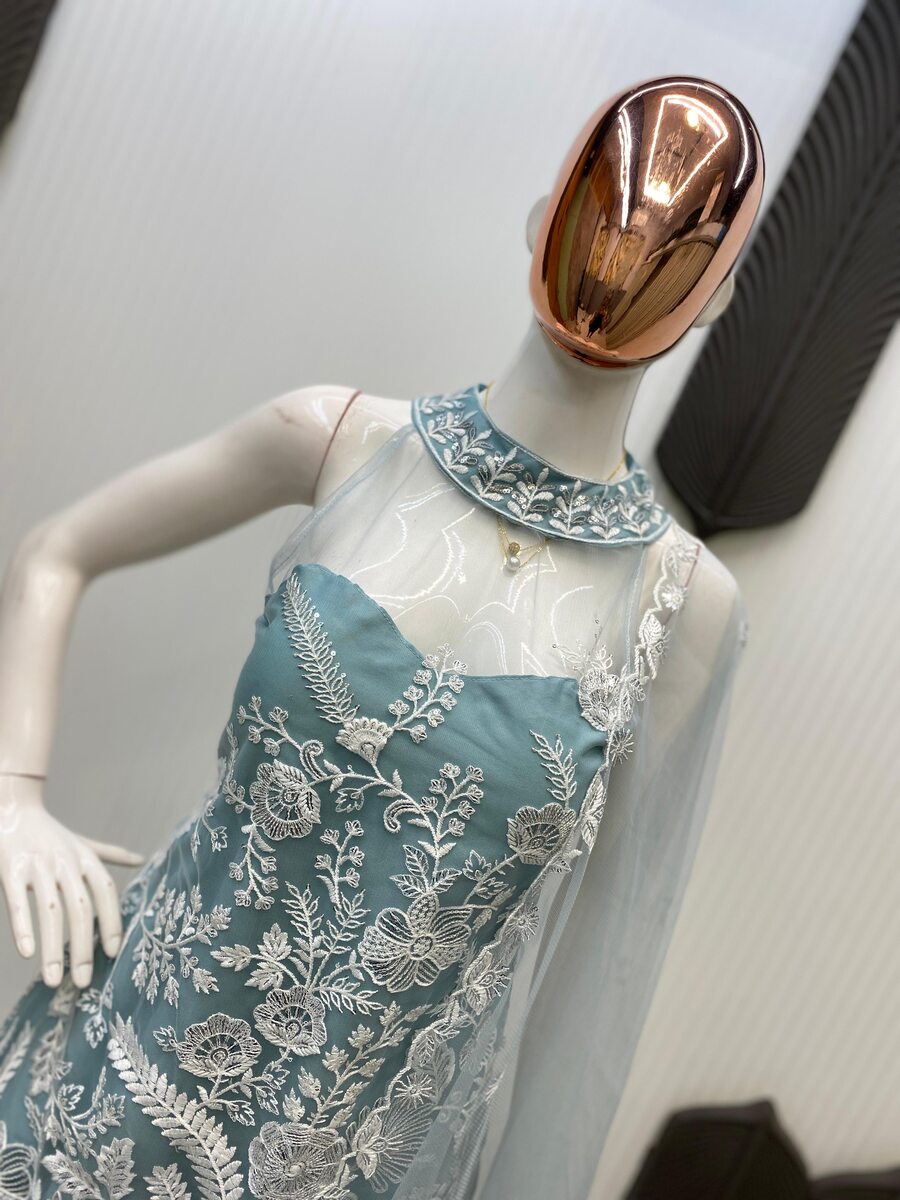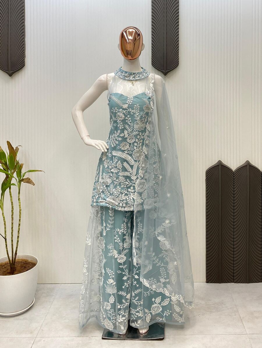 DESIGNER BUTTERFLY NET EMBROIDERY SEQUENCE WORK TOP PALAZZO WITH DUPATTA SKY