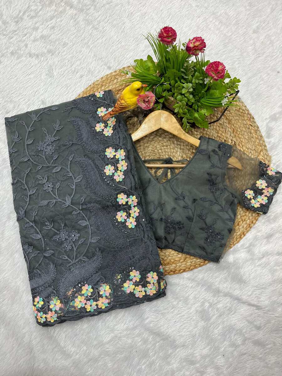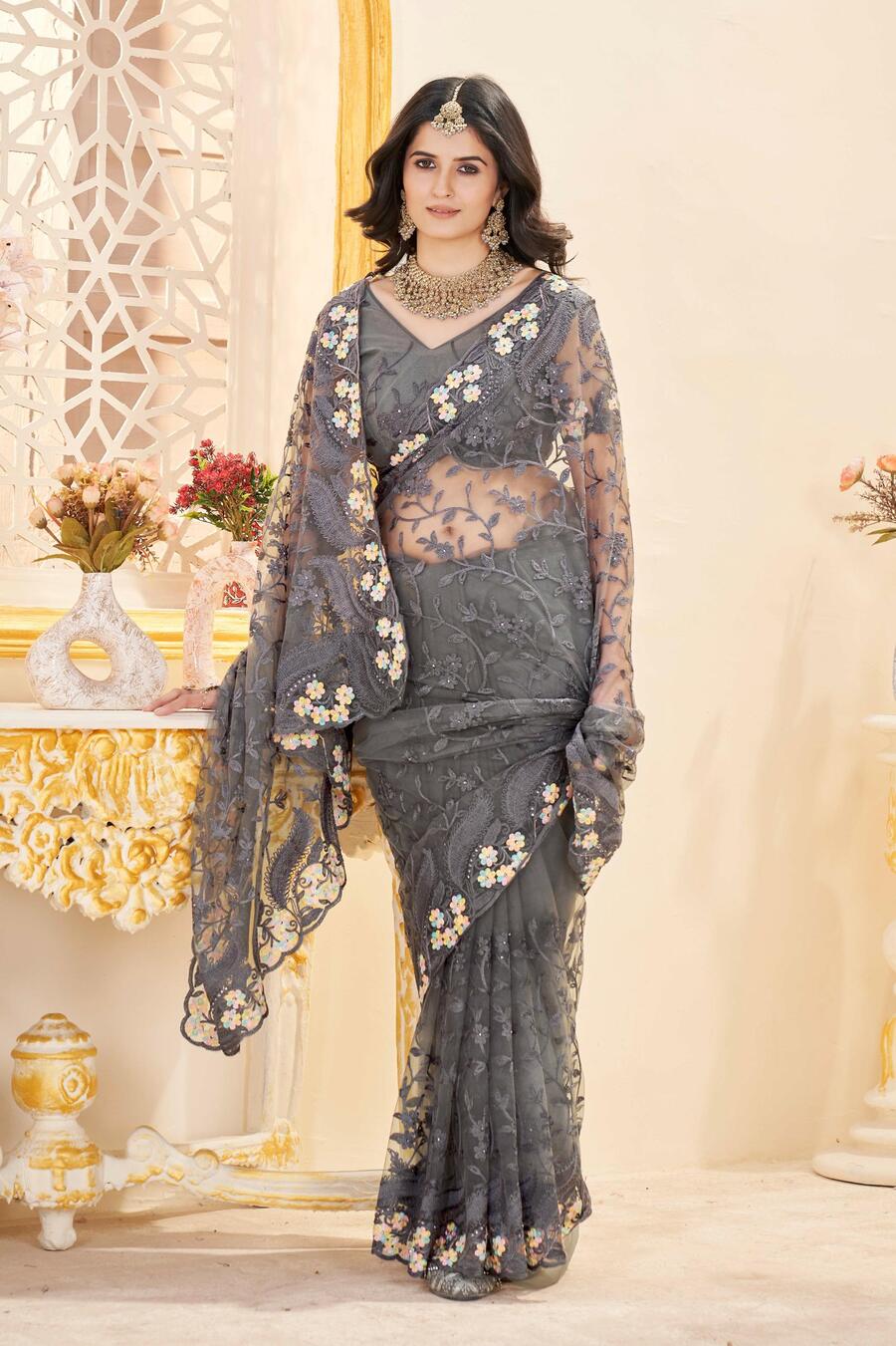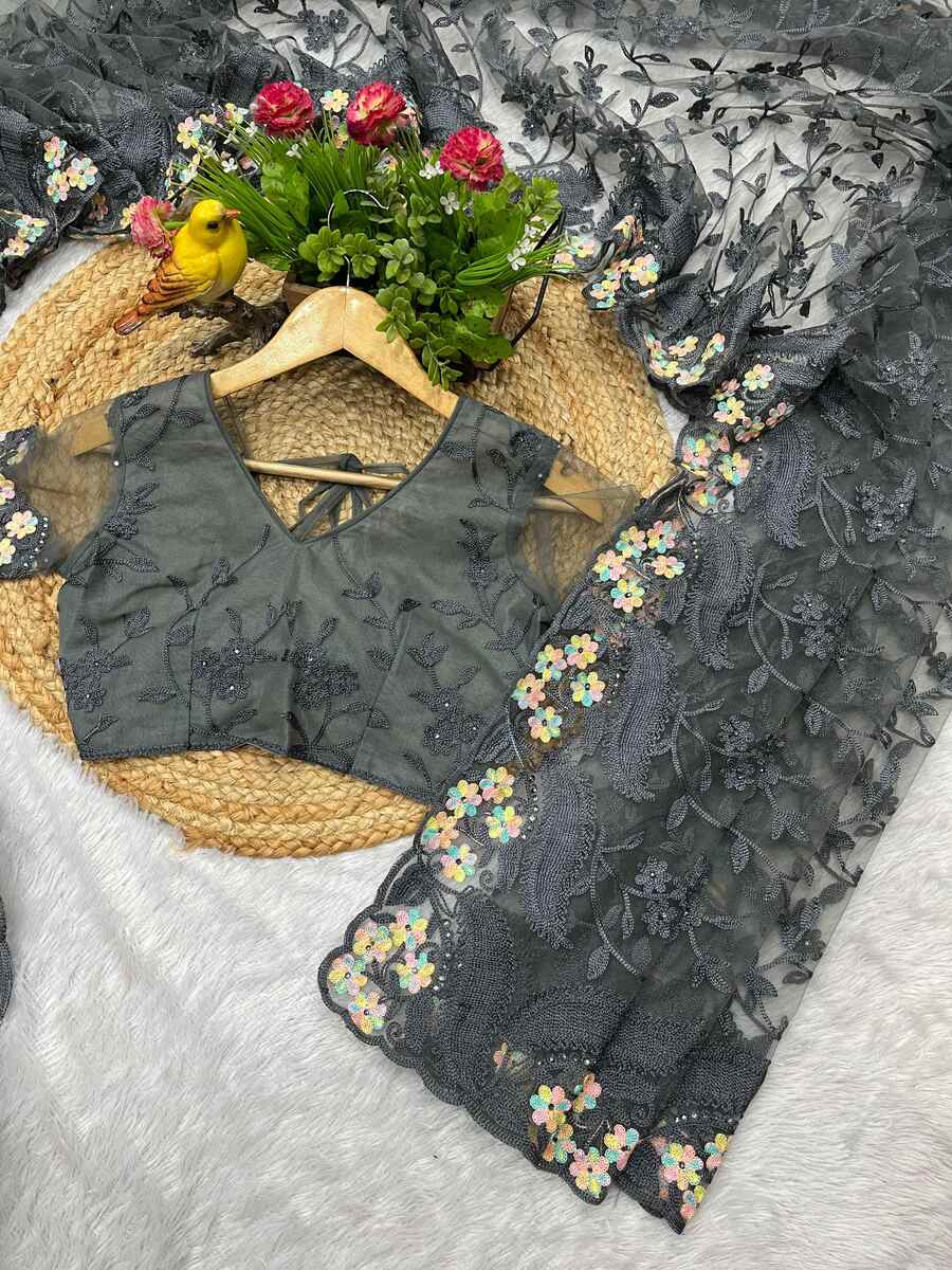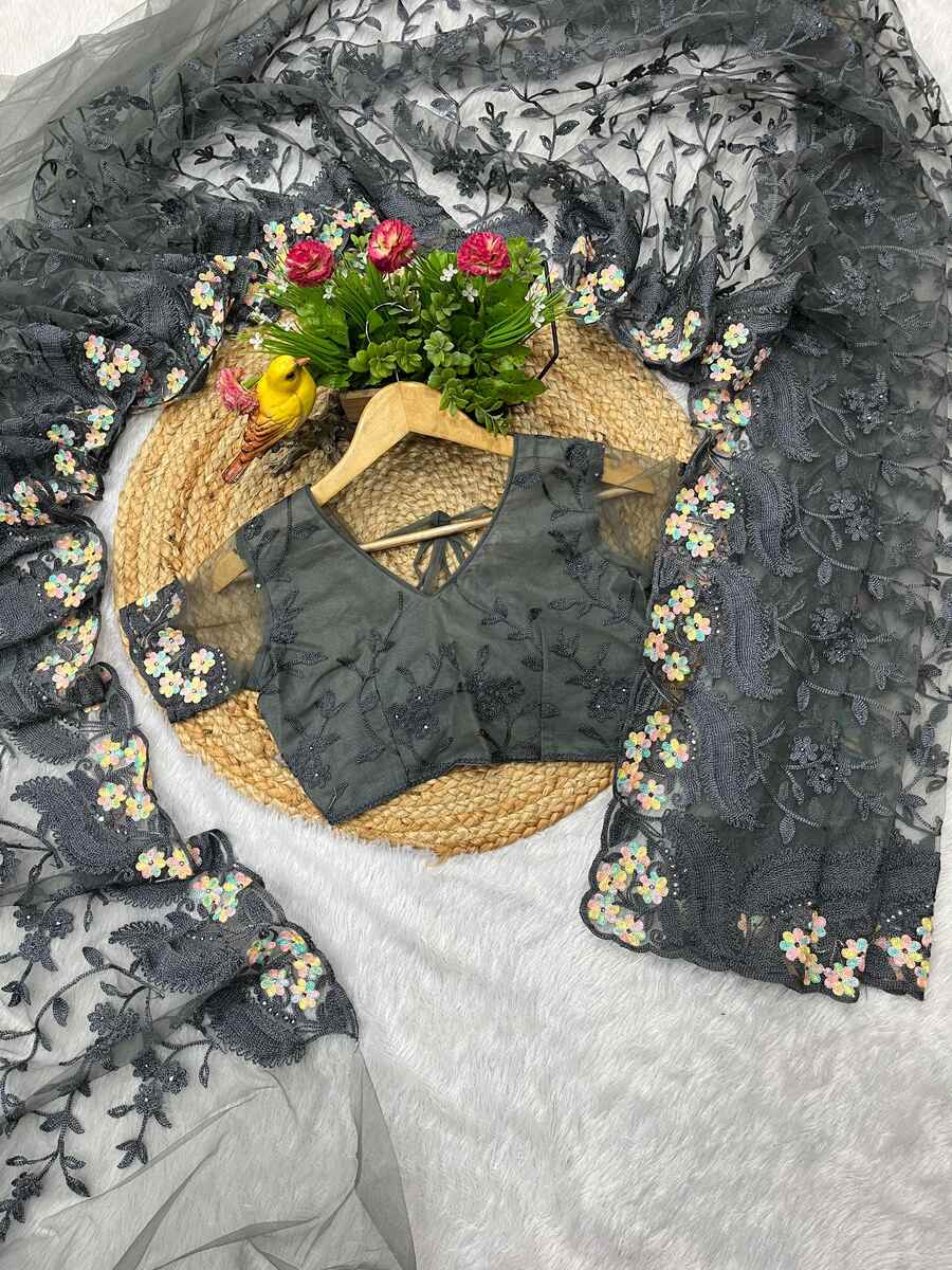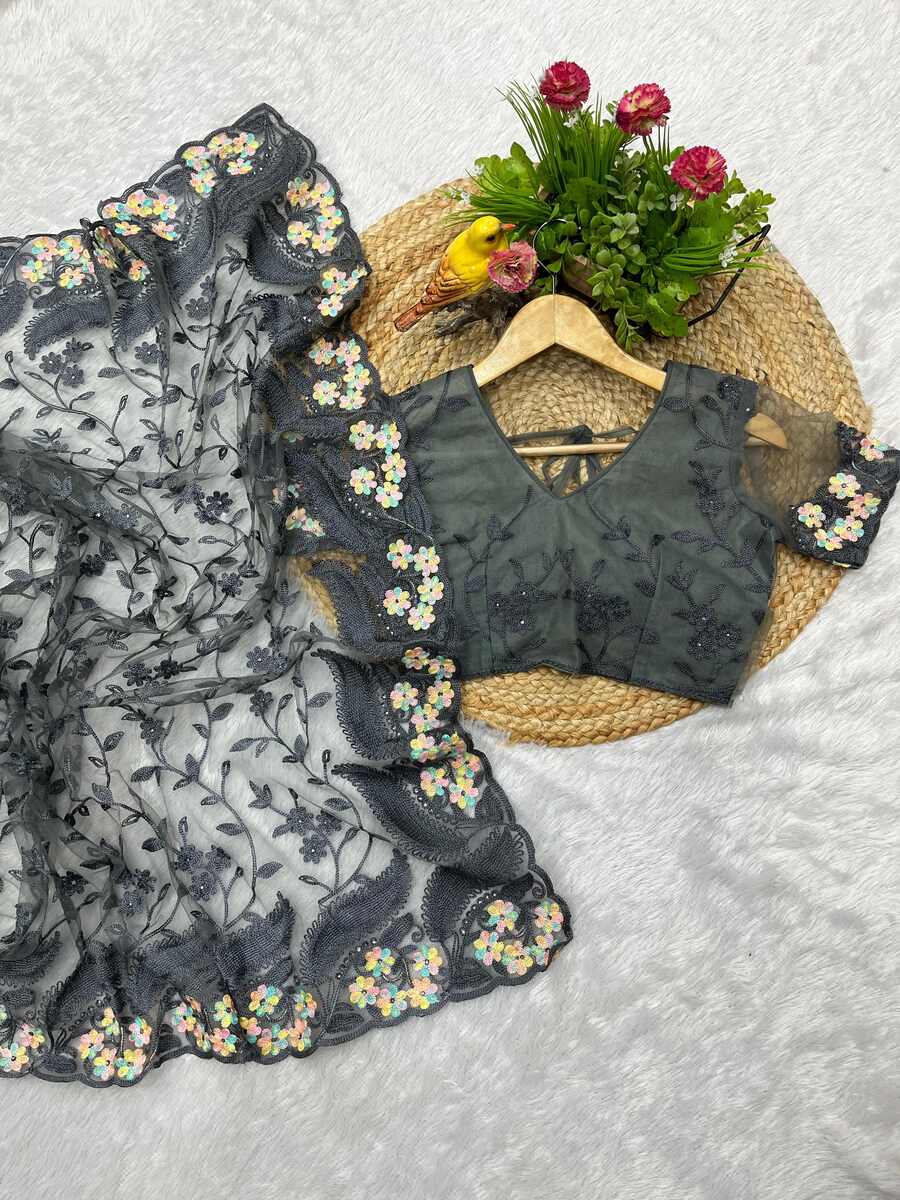 DESIGNER BUTTERFLY NET EMBROIDERY WITH MULTI COLOR THREAD AND STONE WITH CUTWORK BORDER SAREE WITH UNSTITCHED BLOUSE GREY