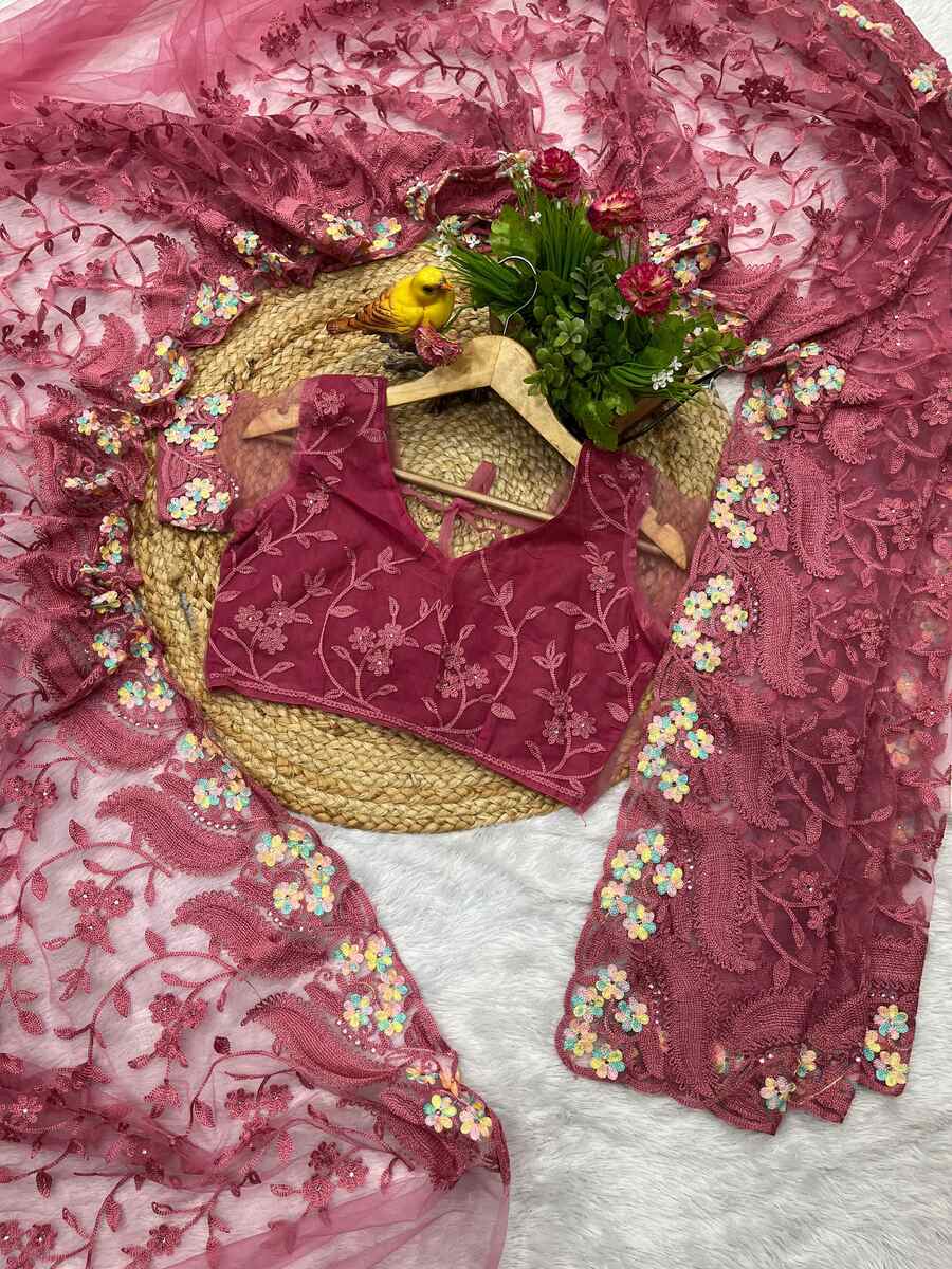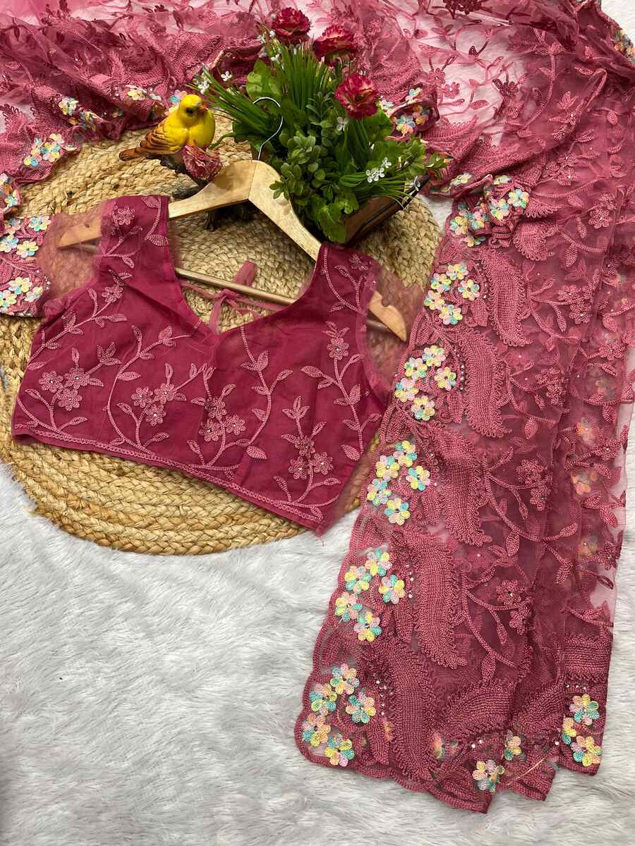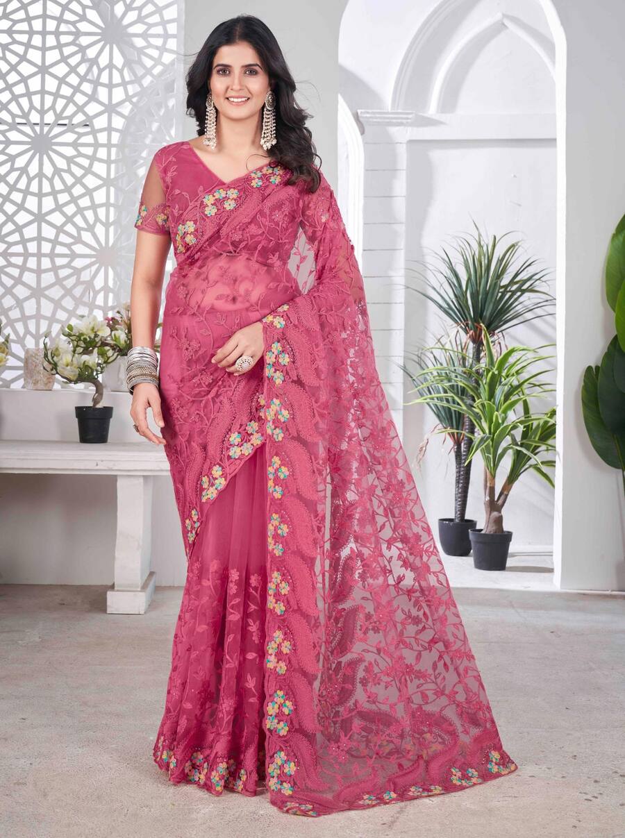 DESIGNER BUTTERFLY NET EMBROIDERY WITH MULTI COLOR THREAD AND STONE WITH CUTWORK BORDER SAREE WITH UNSTITCHED BLOUSE PINK