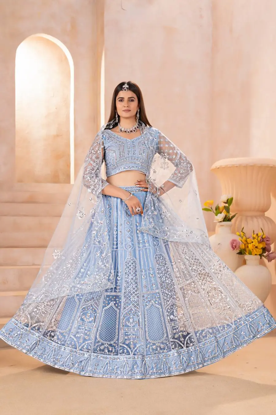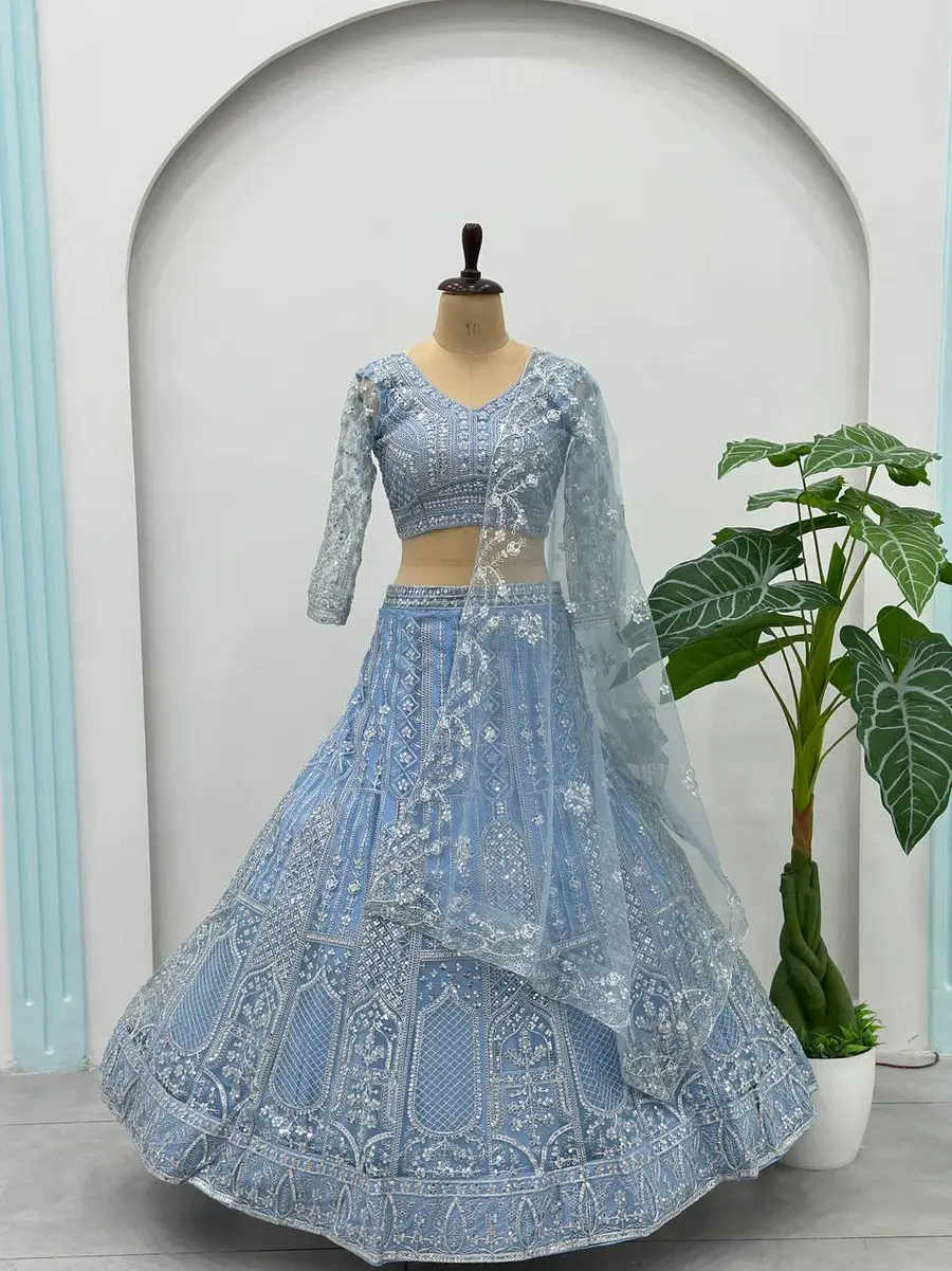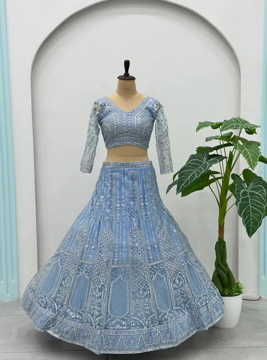 DESIGNER BUTTERFLY NET SEQUENCE AND CODING EMBROIDERY WORK LEHENGA CHOLI WITH DUPATTA SKY