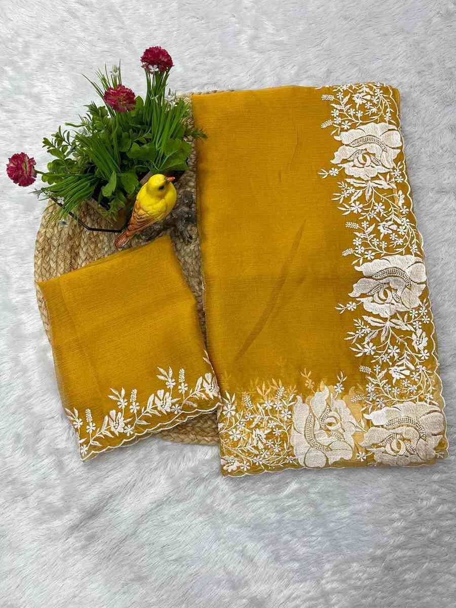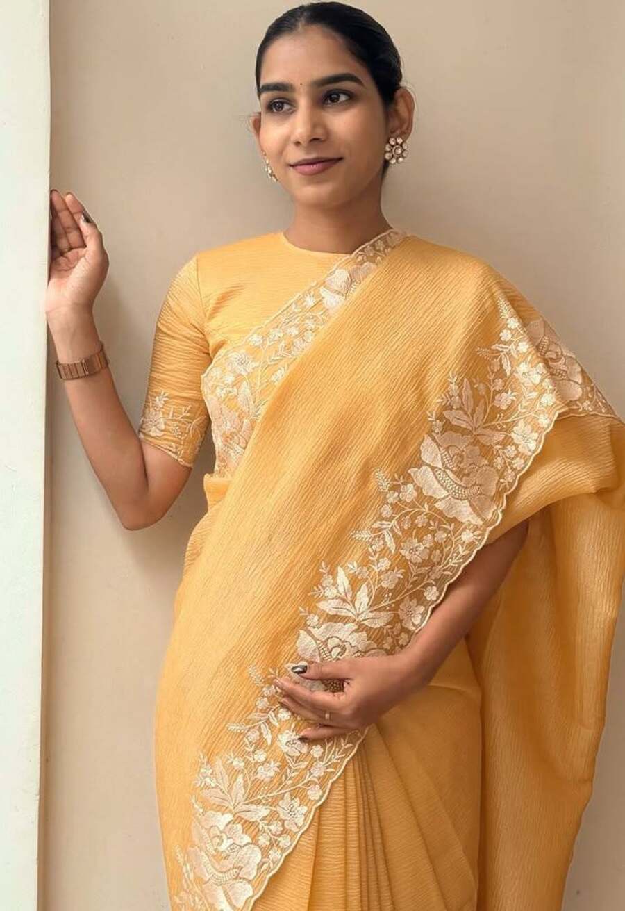 DESIGNER CANDY CRUSH FLORAL EMBROIDERY BORDER OF WHITE THREAD AND CUT WORK BORDER SAREE WITH UNSTITCHED BLOUSE YELLOW