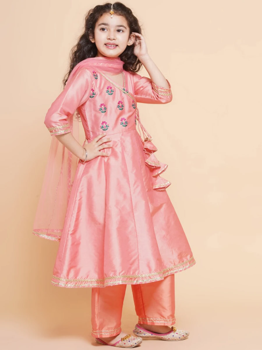DESIGNER CHANDERI EMBROIDERY WORK KID’S TOP BOTTOM WITH DUPATTA BABY PINK