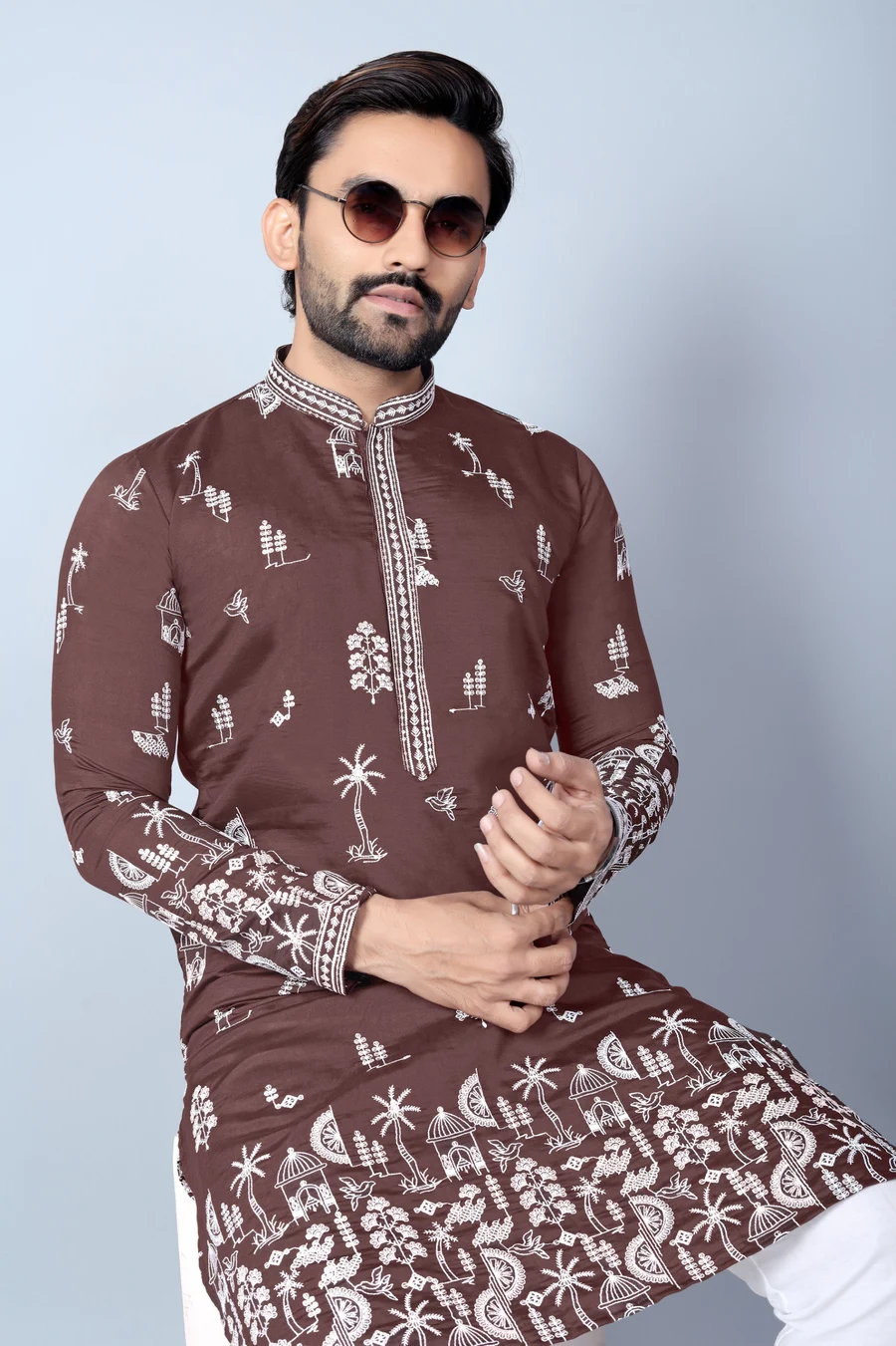 DESIGNER CHANDERI SILK EMBROIDERY SEQUENCE WORK MEN’S KURTA PAYJAMA BROWN