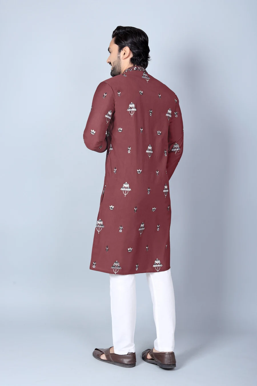 DESIGNER CHANDERI SILK EMBROIDERY SEQUENCE WORK MEN’S KURTA PAYJAMA MAROON