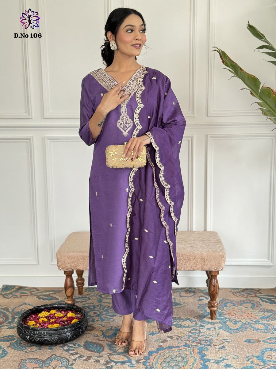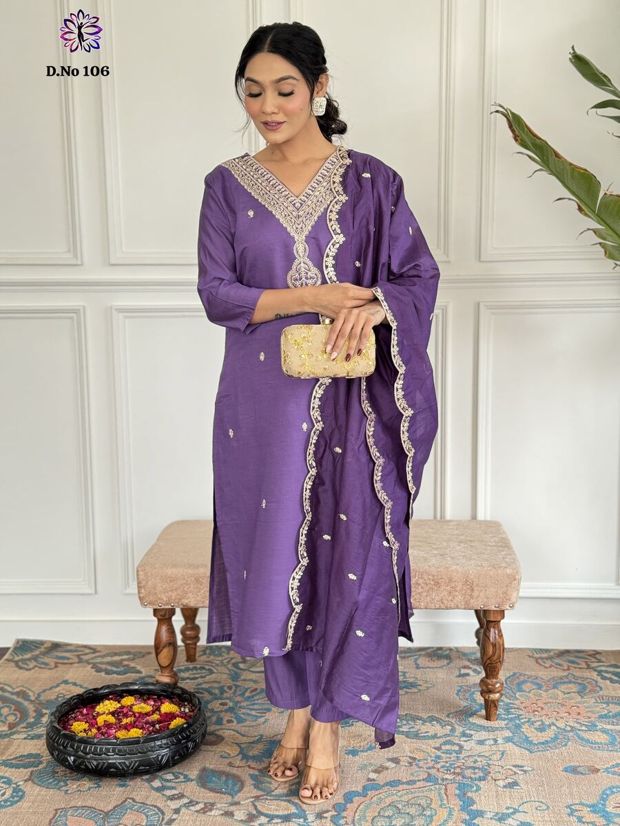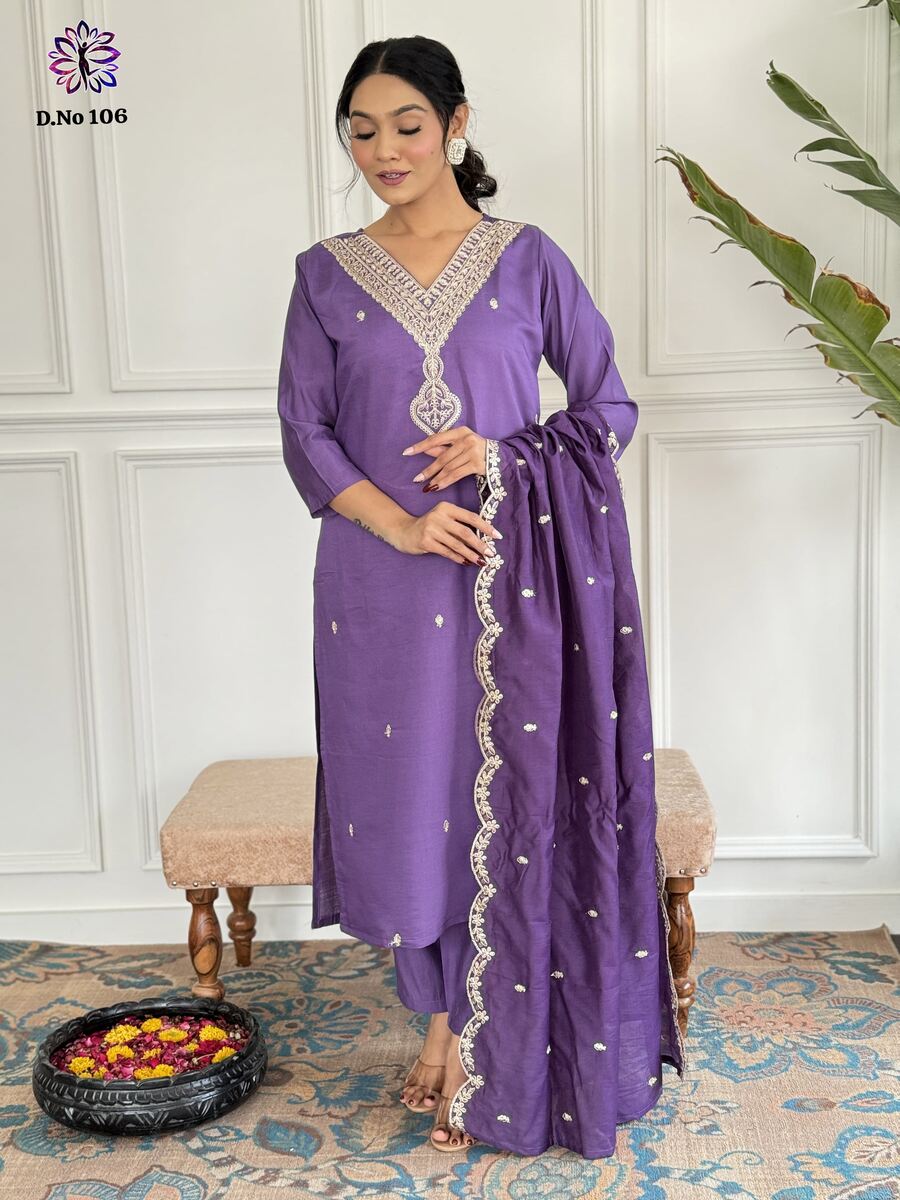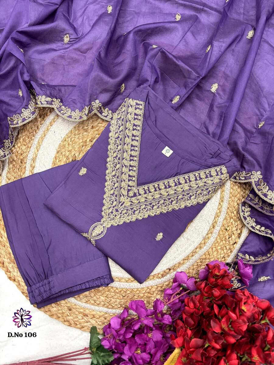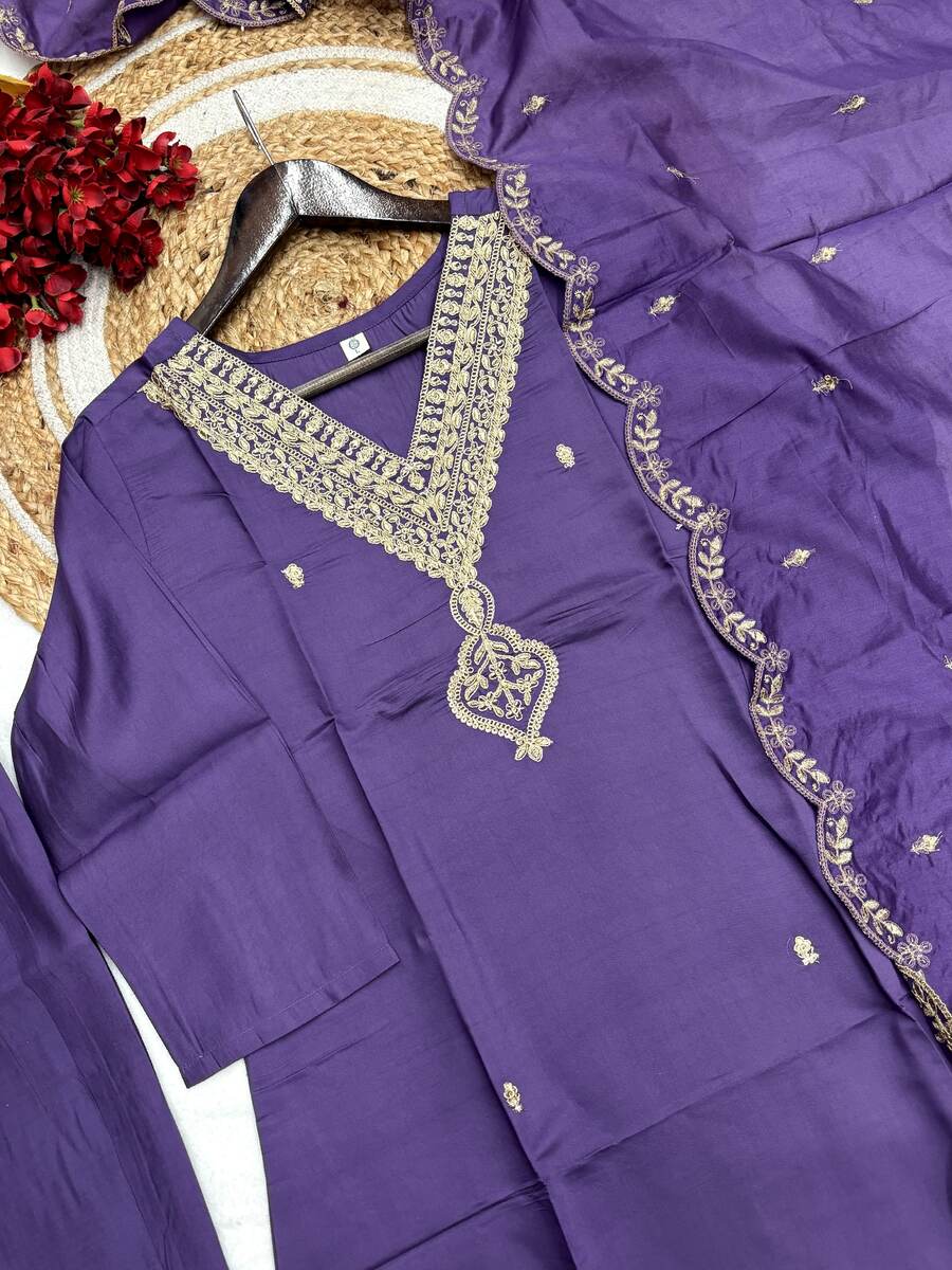 DESIGNER CHANDERI SILK EMBROIDERY WORK TOP BOTTOM WITH DUPATTA PURPLE