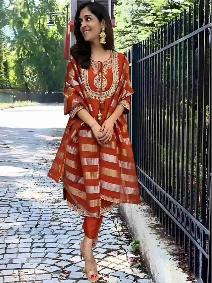 DESIGNER CHANDERI SILK SEQUENCE CODING EMBROIDERY WORK TOP BOTTOM WITH DUPATTA ORANGE