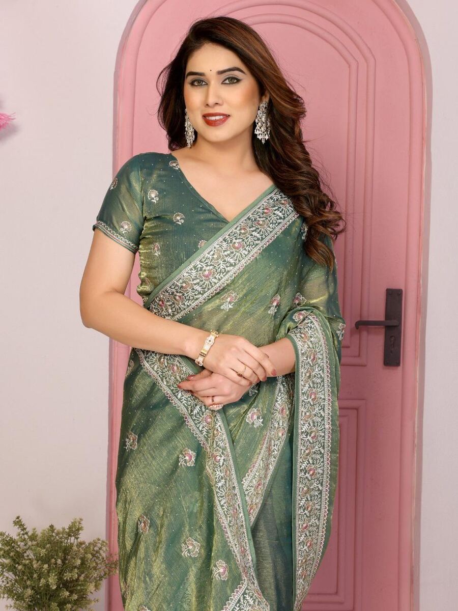 SAREE FABRIC : PREMIUM DIAMOND CHINON SILK WITH HEAVY EMBROIDERY CODING MULTI TREADS AND SEQUENCE WORK