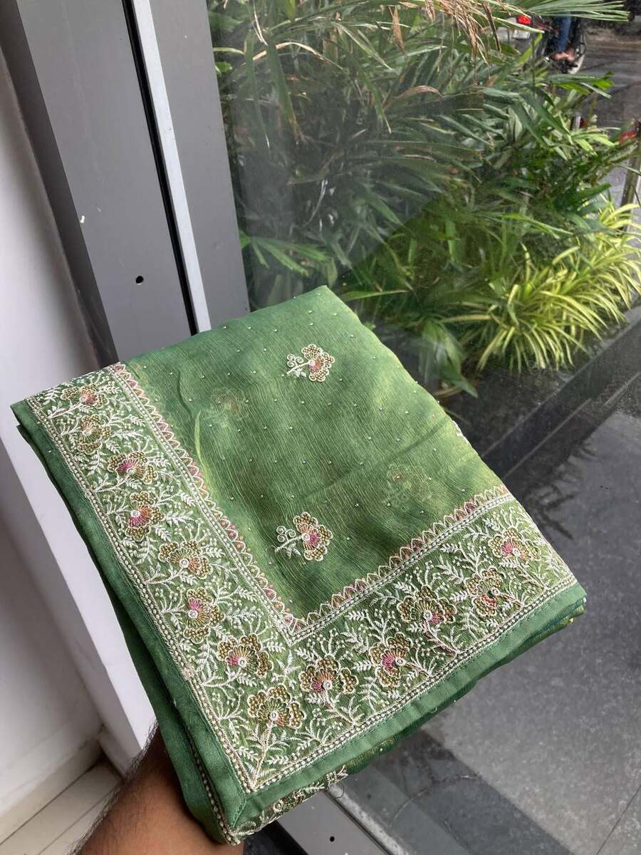 DESIGNER CHIFFON SILK EMBROIDERY WITH PIPING BORDER WORK SAREE WITH UNSTITCHED BLOUSE GREEN