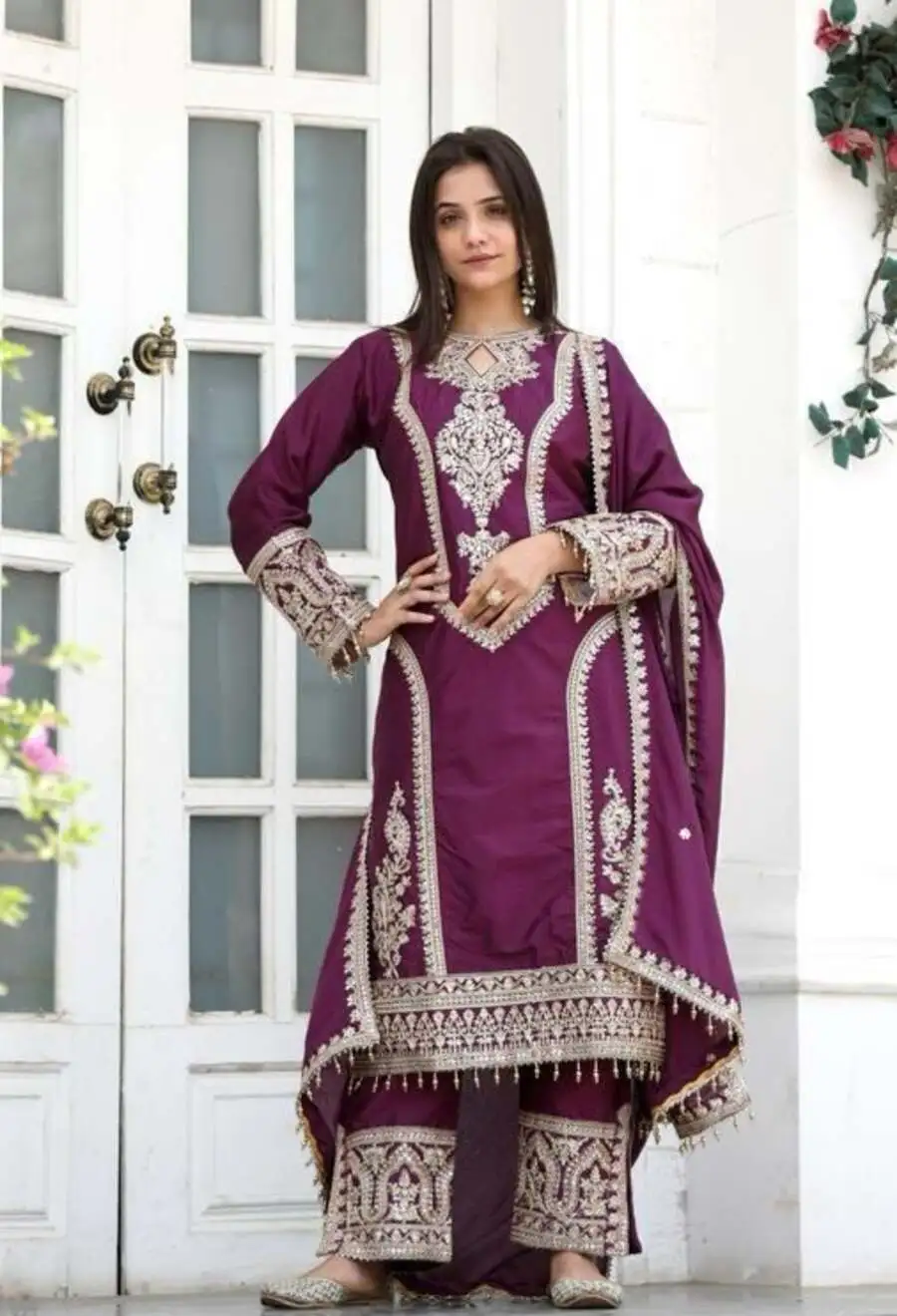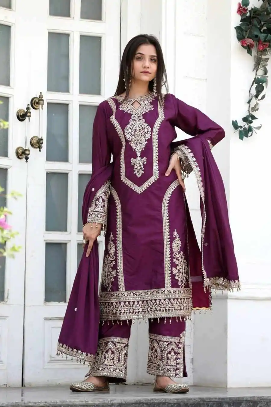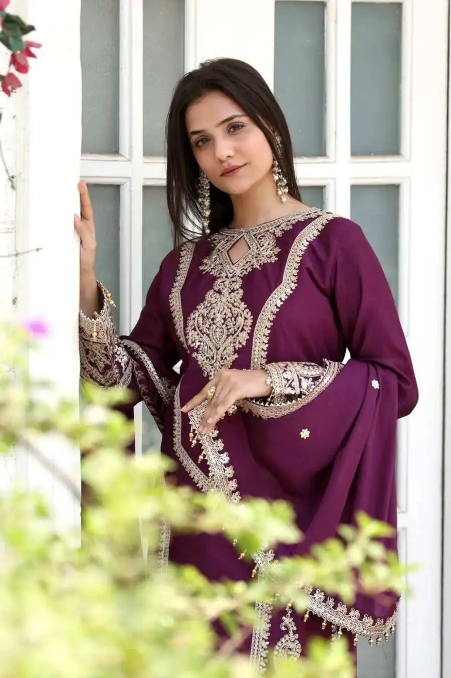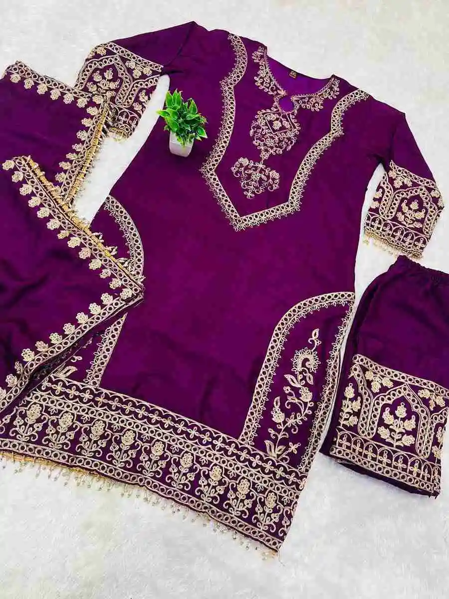 DESIGNER CHINON CHAIN WORK TOP BOTTOM WITH DUPATTA PURPLE