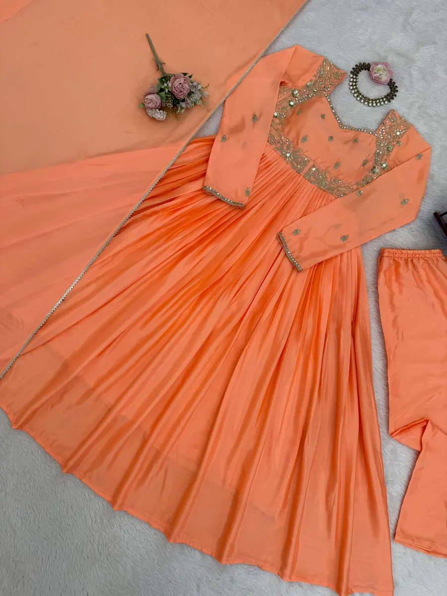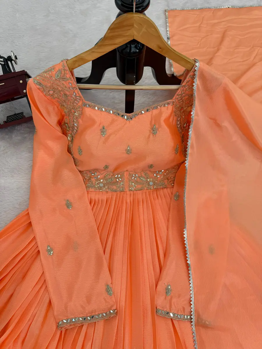 DESIGNER CHINON CODING WITH SEQUENCE WITH REAL MIRROR WORK GOWN BOTTOM WITH DUPATTA PEACH