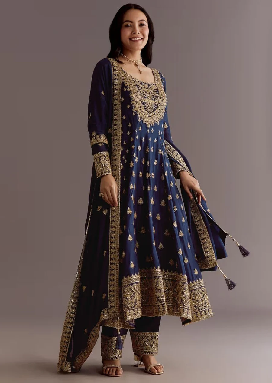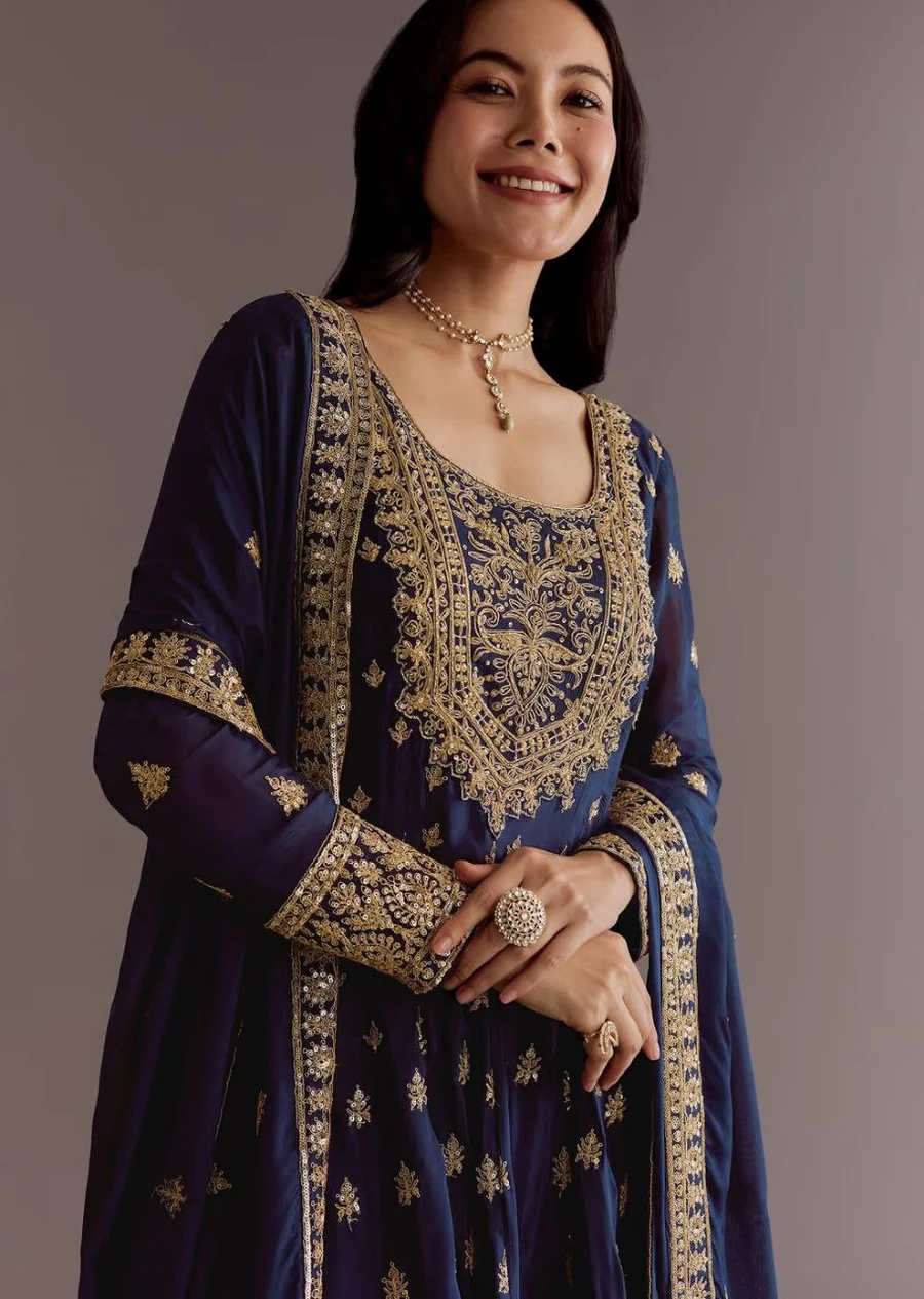 DESIGNER CHINON EMBROIDERY SEQUENCE WORK TOP BOTTOM WITH DUPATTA NAVY BLUE